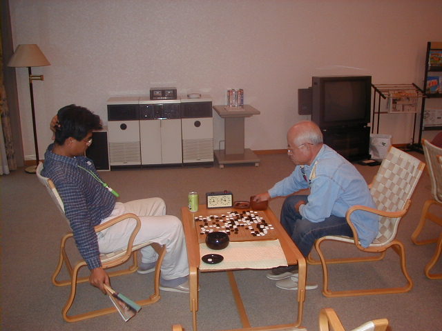 及川さん(奥)は久しぶりの参加。難しい戦いなのか、頭をかかえていらっしゃいますね。橋口さん(6段)との互先対局です。 |