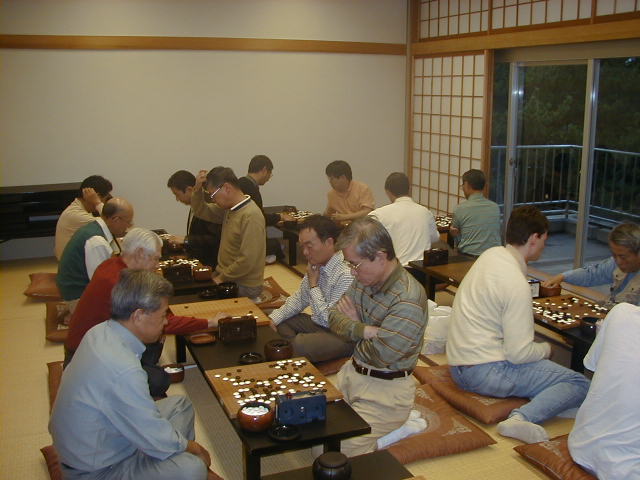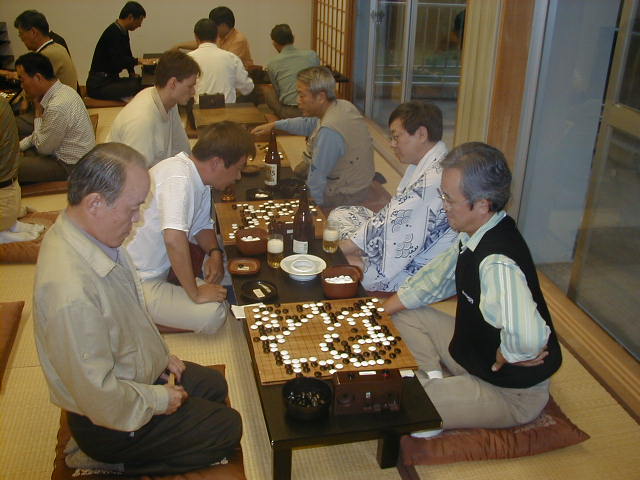 赤川さん(手前右) は初参加でした。岸原囲碁部会計と同じく中川敬一師匠門下生です。 |