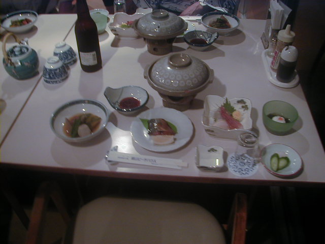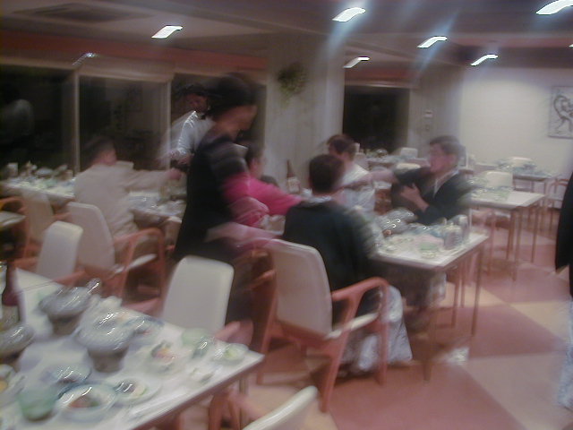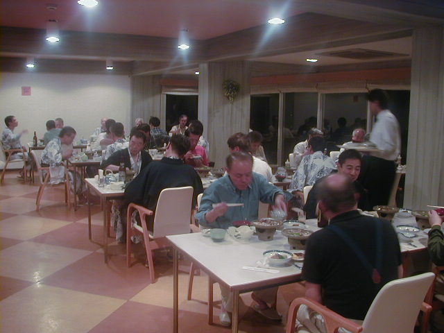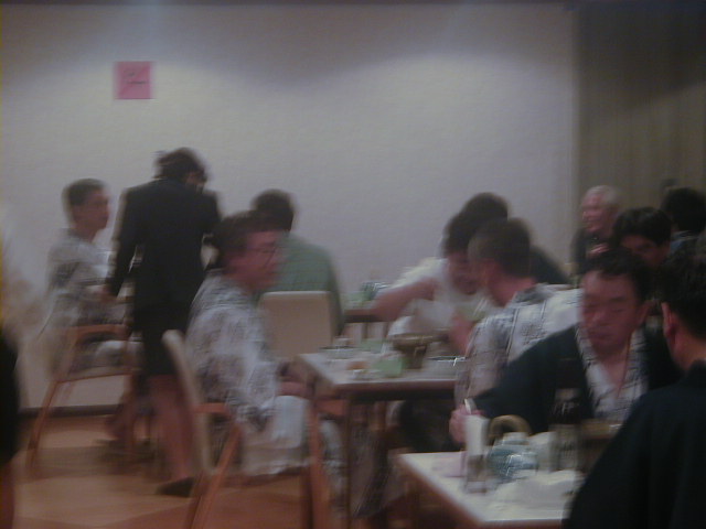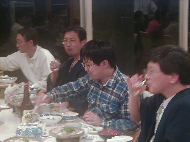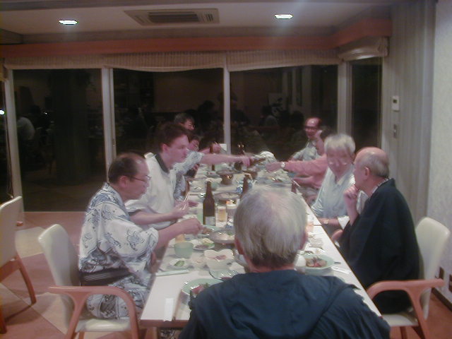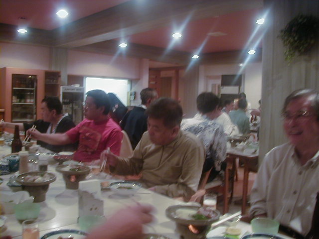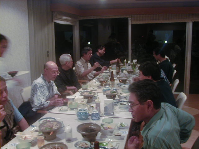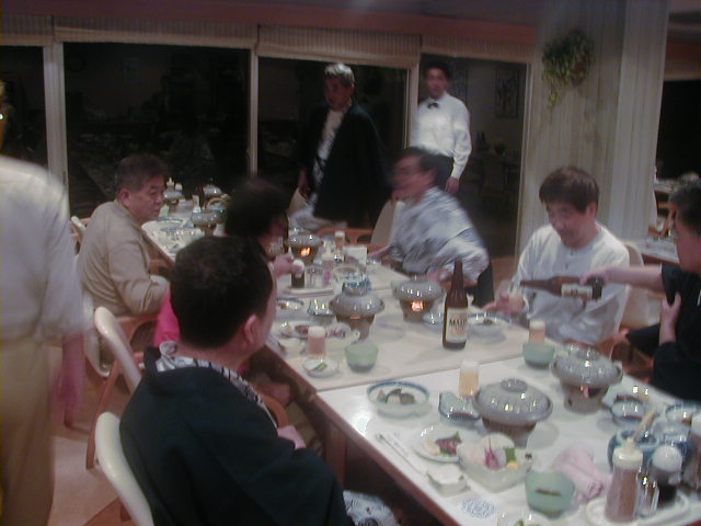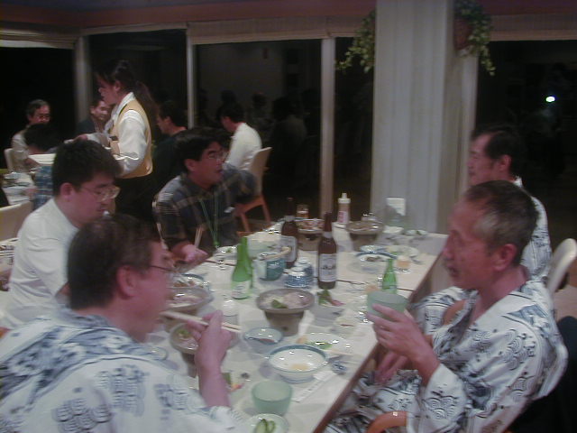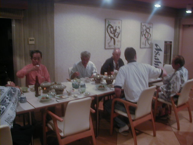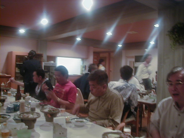 酒がはいって、話もはずみます。奥の永田さんがよく出張するところは金子さんが現在勤務している金沢市。ということで、この合宿のあと、現地でおちあう約束をされたそうです。 |