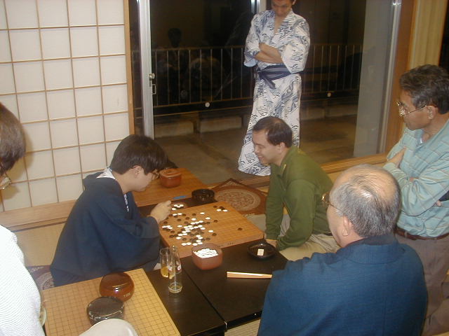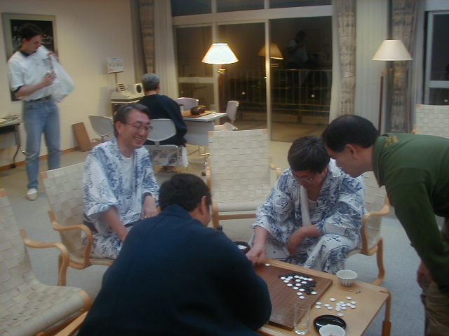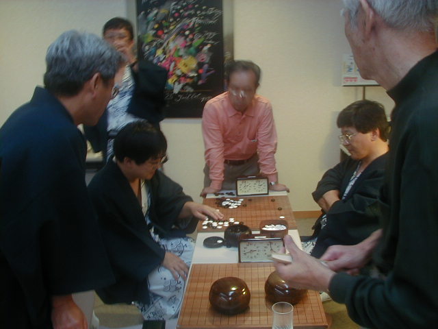 自由対局の波松-谷野戦も終了し、感想戦が始まったようです。加藤さんや工藤さんらが感想戦にくわわり、にぎやかでした。Martinさんは笑いながらこの様子をみまもっています。 |