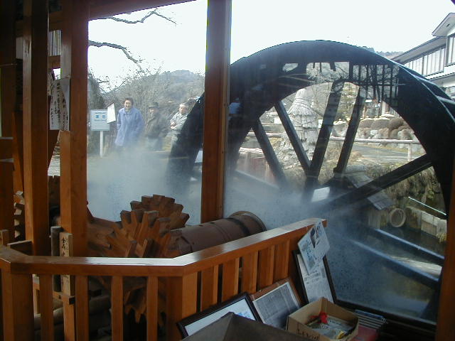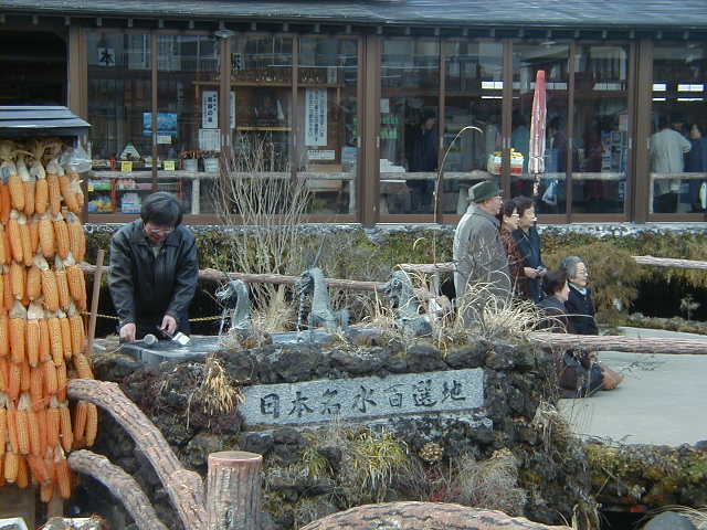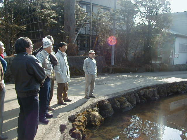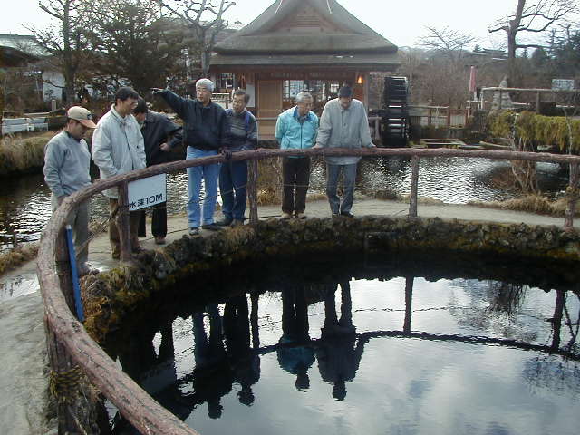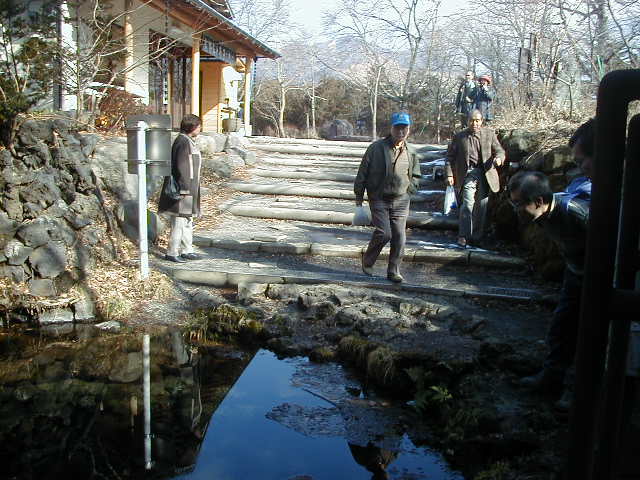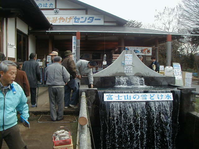 富士山の雪どけ水、「30秒間手をいれることができますか?」と挑発的なことが書いてあったので、囲碁部の面々が次々に挑戦しました。「つめたーーい!」 |