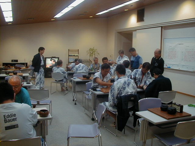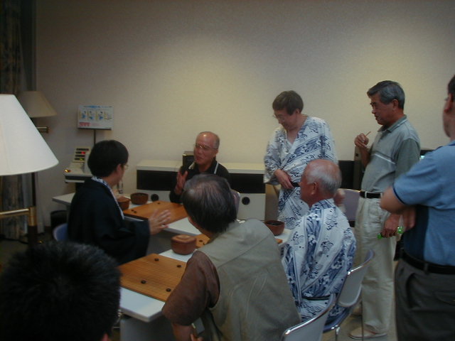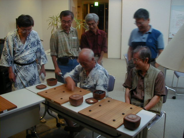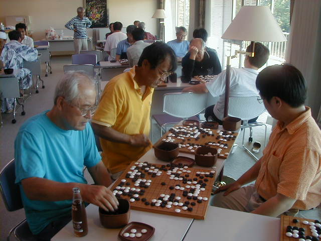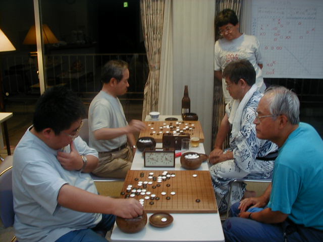 夕食休憩後の指導碁です。入浴中の光永先生を待ちます。「自由置き碁だから、好きなようにうとう」 これに、まわりから、いろんなユニークな案が提案されました。 |
