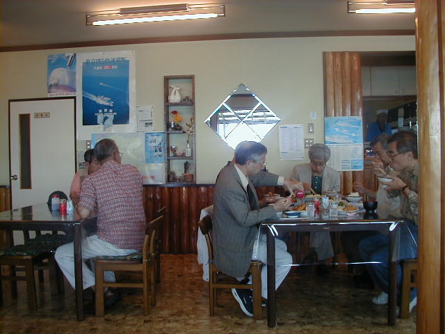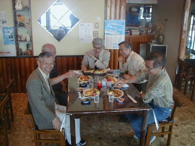 いつもの「潮亭」に到着しました。すると、なんということか、湊号の5名にはすでにアジフライが準備されていました! 皆、「え??」 と驚いていましたが、実はフェリー乗り場で電話注文していたそうです。あまりの手際よさに当の本人達もまわりも大笑いとなりました。 |