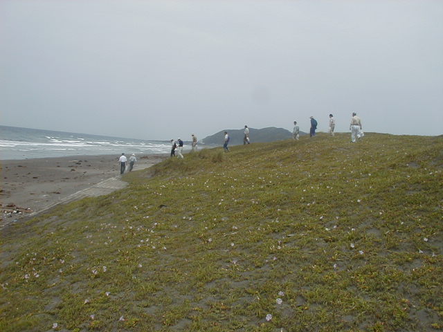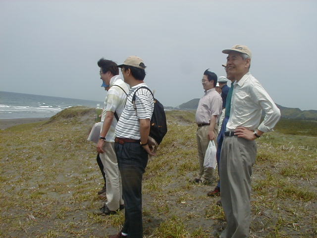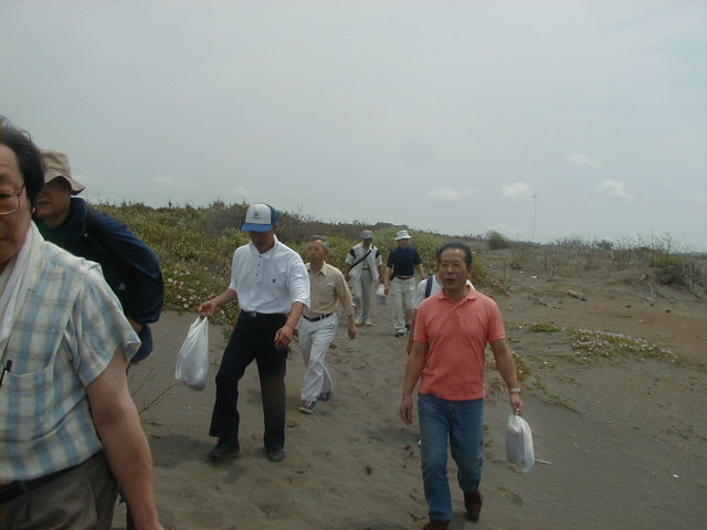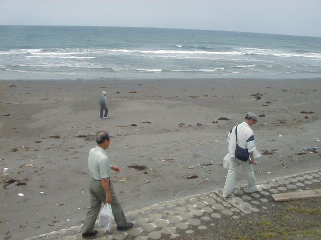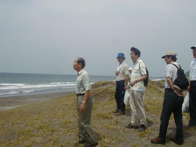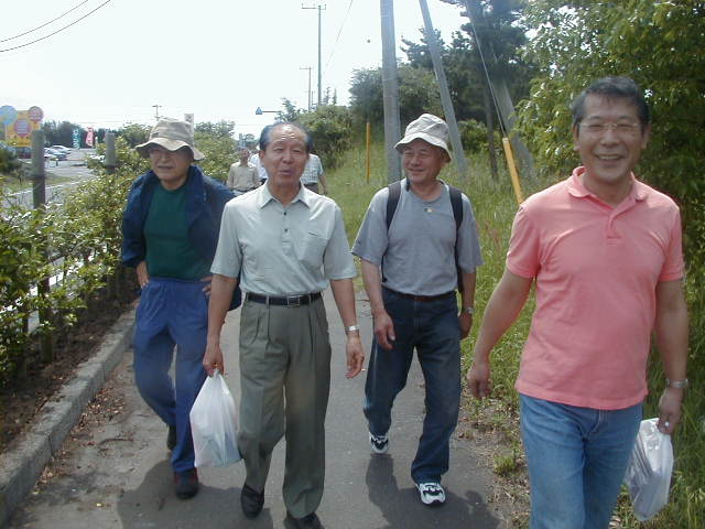 海岸付近の道路を歩きはじめました。聞こえてくる鳥の鳴き声に「ほととぎすとうぐいすはどこが違うんですかね?」との質問に「そんなの全然違うじゃなーい」と笑顔でこたえます。 |