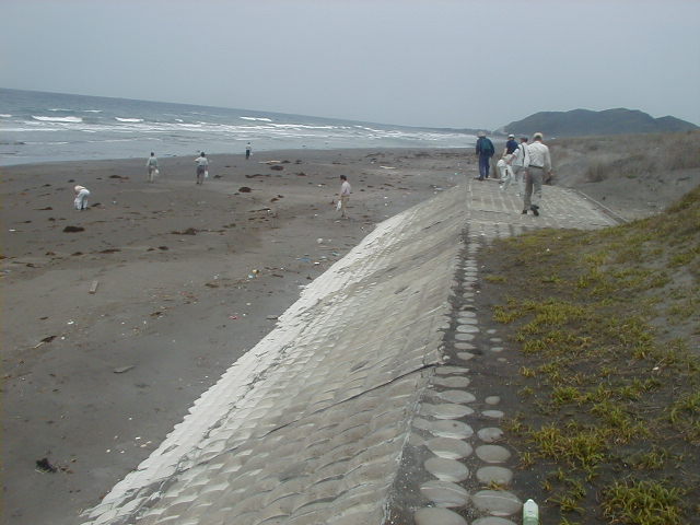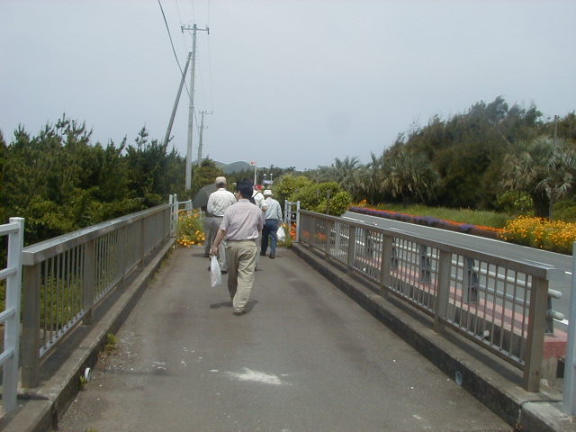 防波堤でしょうか、階段のような道をおりていきます。 |