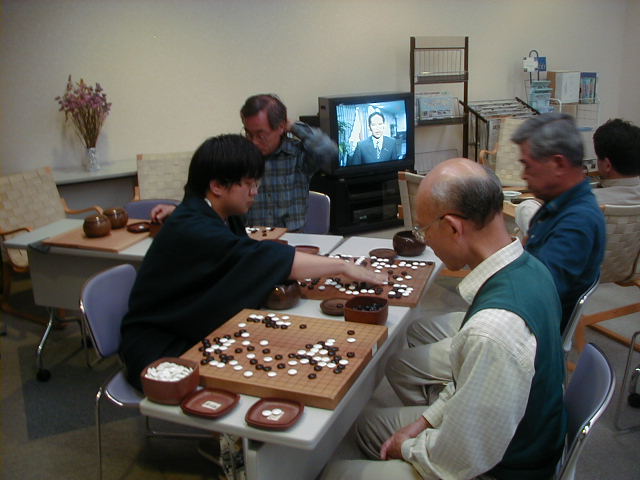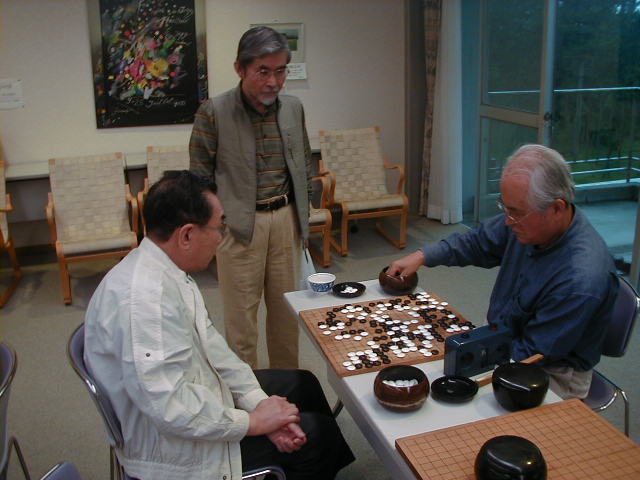 光永先生の指導碁は恒例です。いつも、丁寧に教えてくれます。 和田さんは、久しぶりの参加、6子で対局中です。 |