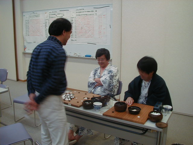 池上さんが、逆コミの手合いで先生にいどんでいます。観戦は、森さん、 池上さん、みごと勝利をあげました! |