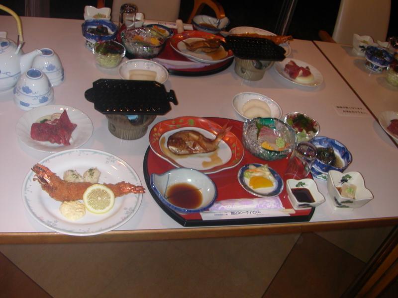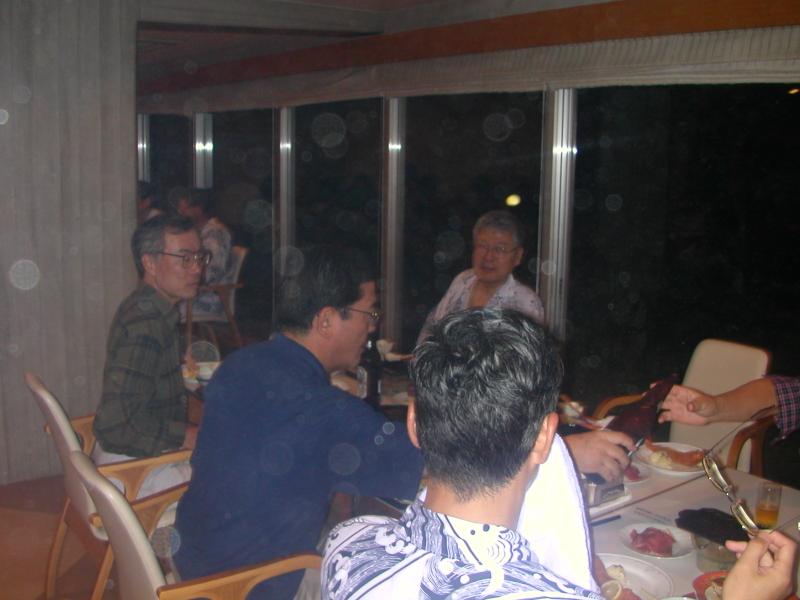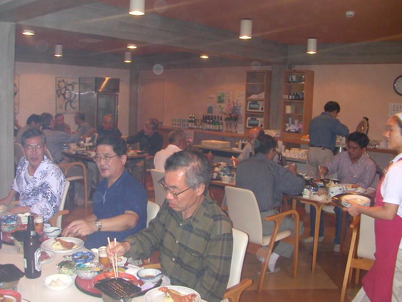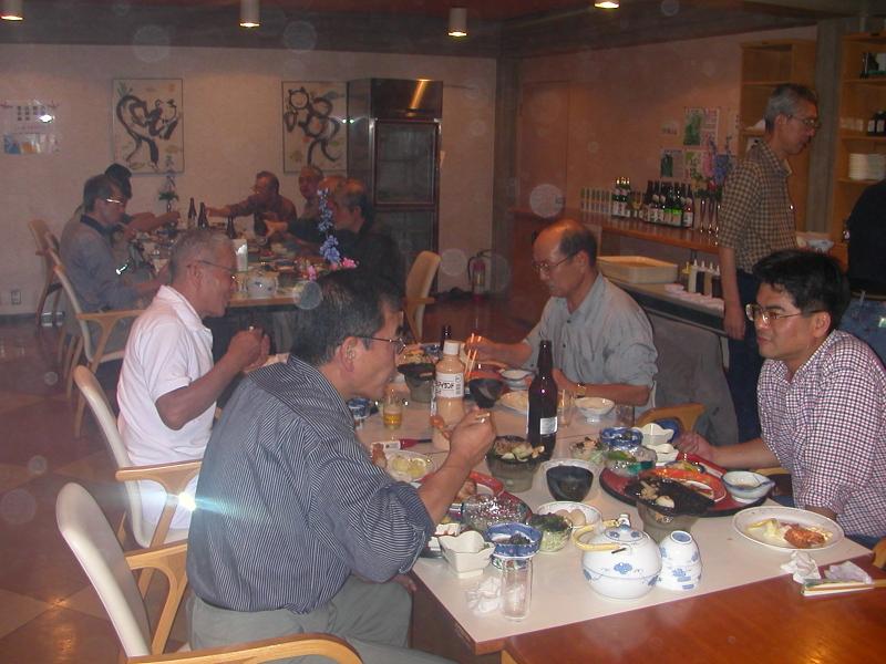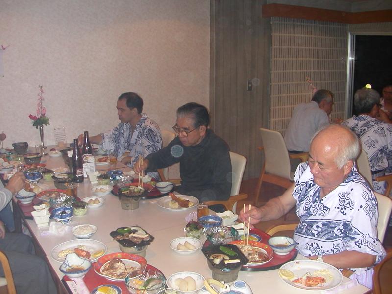 夕食の時間、これが合宿の楽しみのひとつです。今夜もなかなか豪勢な食事。 |