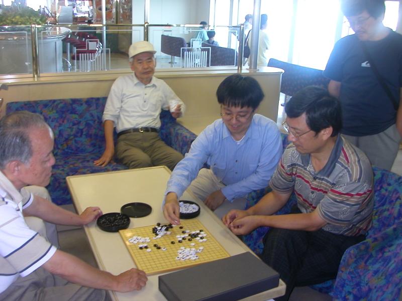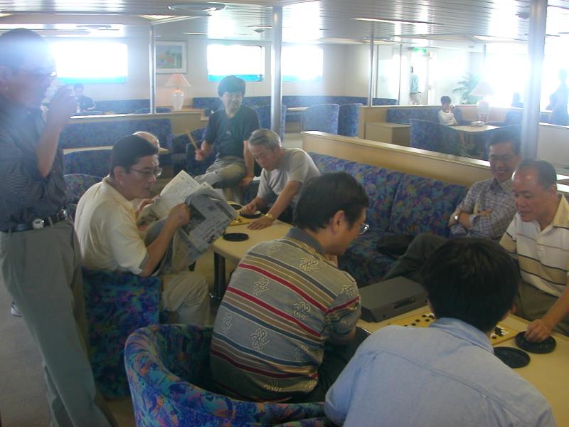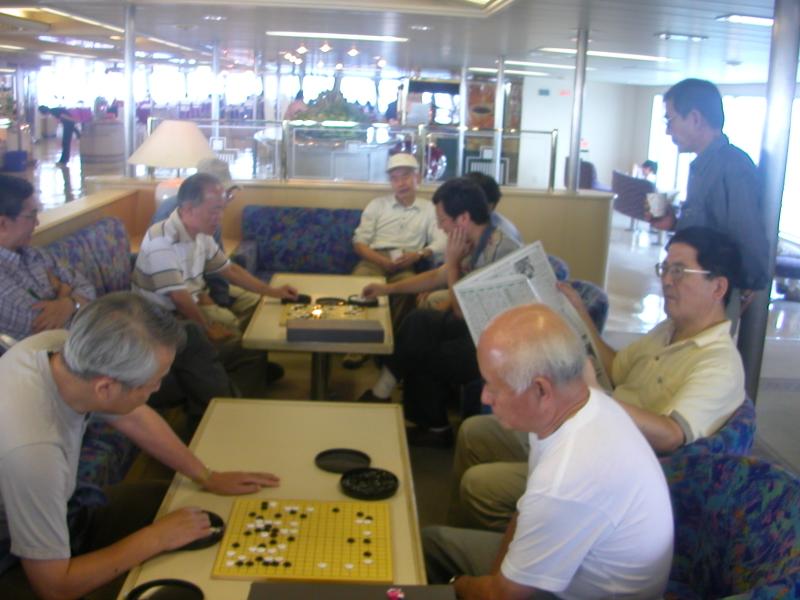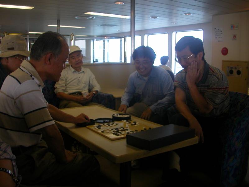 帰りのフェリーも囲碁がさかんでした。今回は光永先生も観戦されています。 |
