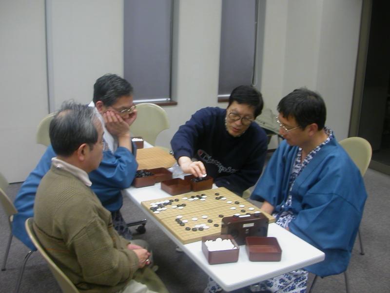碁のほうは、深夜まで検討が続きました。みなさん、熱心です。 |