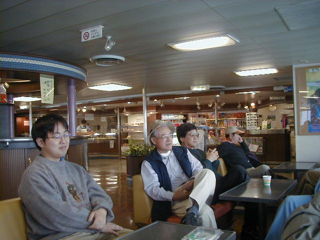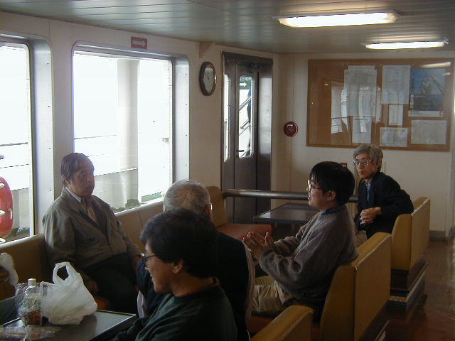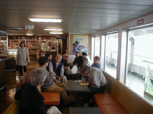 いよいよフェリーに乗り込みました。光永先生のまわりに自然と人垣ができます。 高橋さんは、売店で寿司セットを買ってはやばやと食事、「高橋さん、いつも我々はフェリーを降りてから食事してんですよ。」「ああ、そう、まあいいや」 |