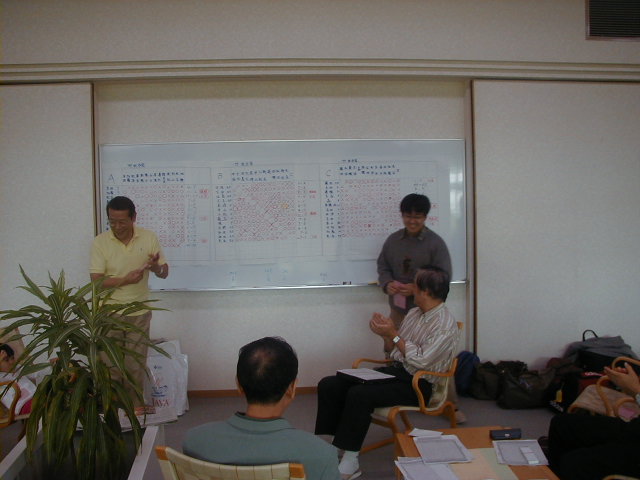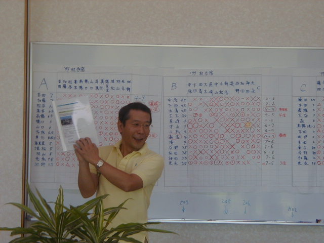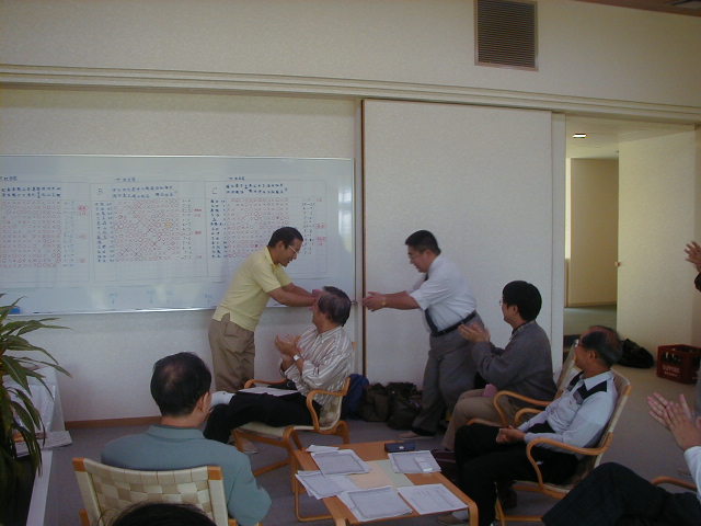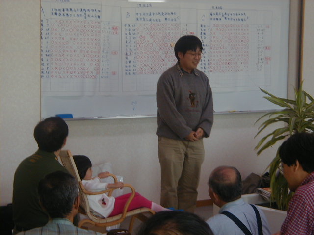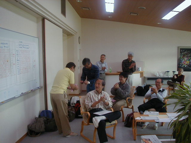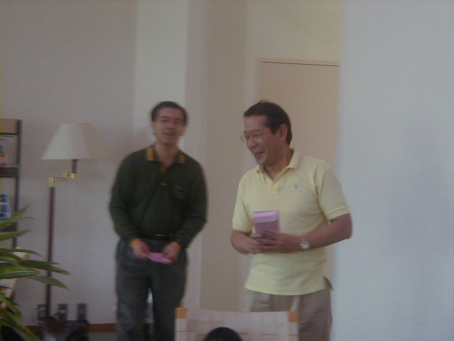 さて、それでは成績の発表でーす!! えーと、Aクラスの優勝は加藤さーん!あれ、どこにいる? さっき、めしくってたよー。えー!? といっていたら、後ろからでてきました。。 |