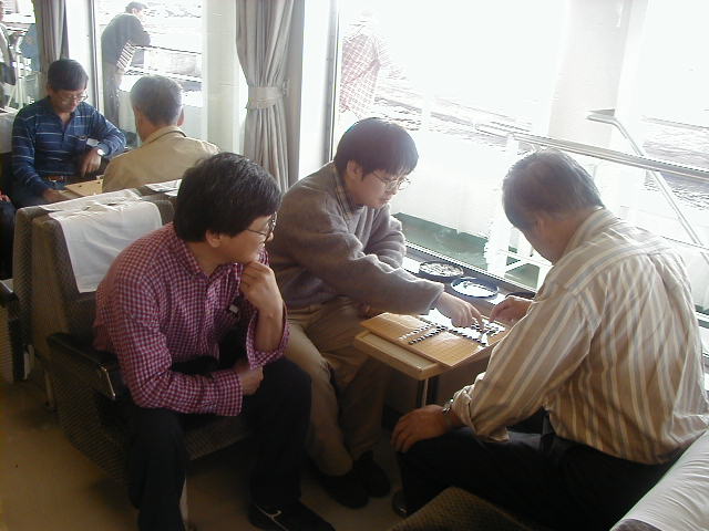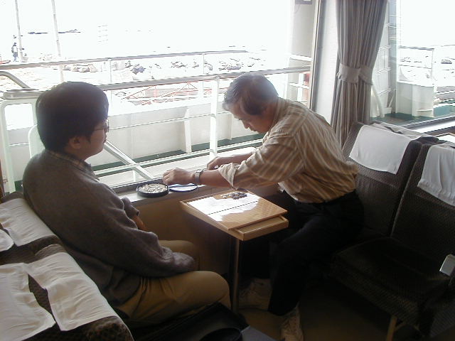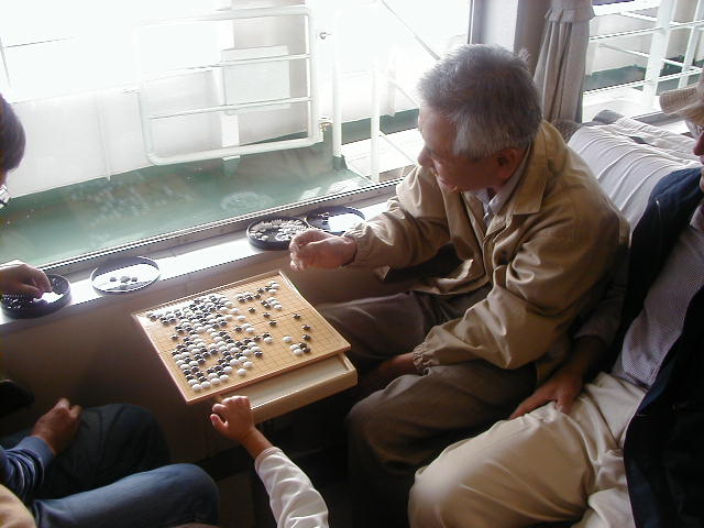 やはり、船の上では対局ですか。携帯碁盤の登場です。藤田さんと山口さんの