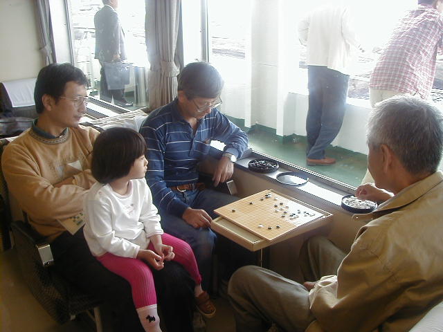 実は対局ではなく、理論の確認です。車の中で中国ルールでは、最後に半コウが多く残ったときに、日本ルールとの違いがきわだって差がつく、という高橋さんの説に、先生がそれは違うといっていたのです。わざわざ盤をだして確認することになりました。 |