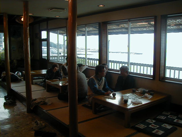 食べ終ってでてきました。「すごいところで釣りやってんなー!!」どうやら、海の中にある小さな岩場で釣りをやっている一行があるようです。満ち潮のタイミングはどうだったかな? |