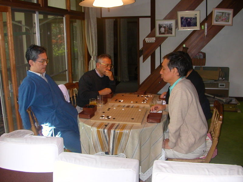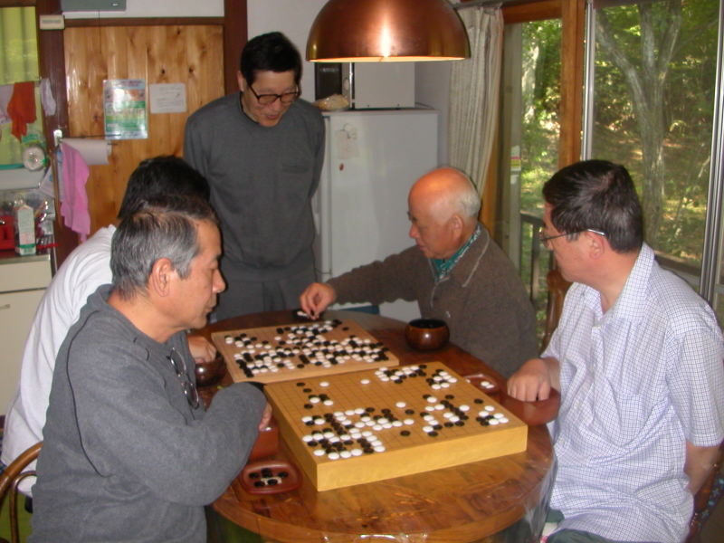 温泉あがりのOさんを見たH山さん、「あれー!oさん、よくよくみると、髪の毛が、、」「いやー、もうそんな年なんですよ」「そうだったのかー、ふだん、よくよく見ないからねー。」そこへ、S藤さん、「あれー!H山さん、よくよくみると、やせてない?」「そうだよ、ぼく10Kgくらいやせたからね。。。」皆さん、年に何度も会う間柄ですが、ふだんは相手のことをよくよく見ないようですね。見るのは盤面ばかりなのでしょうか(笑)