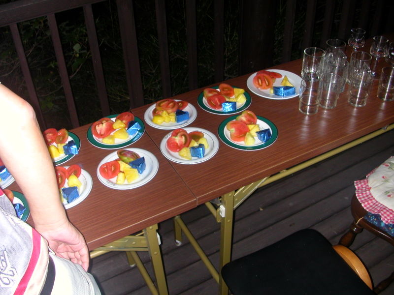 夕食の時間です。 青、赤、黄と見るからに飾り付けがみごとな色彩になってますね。 |