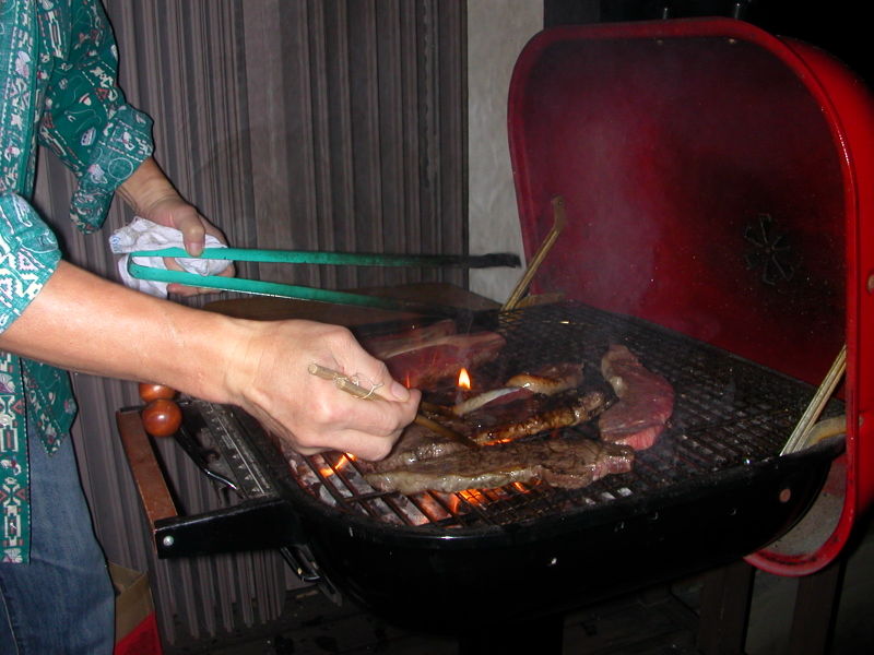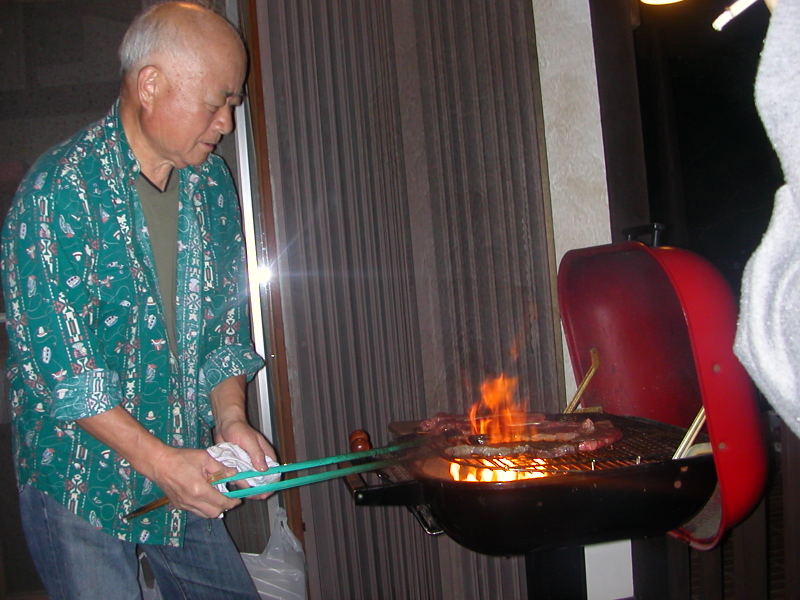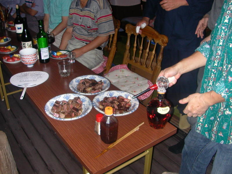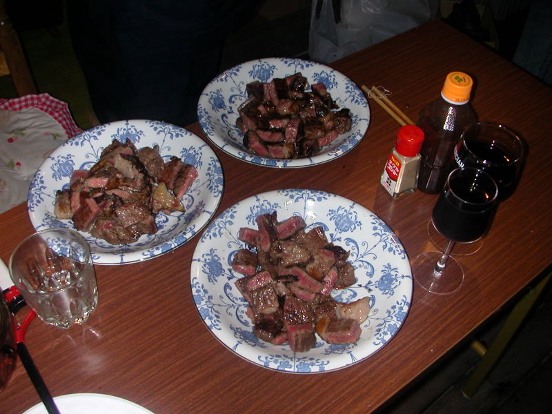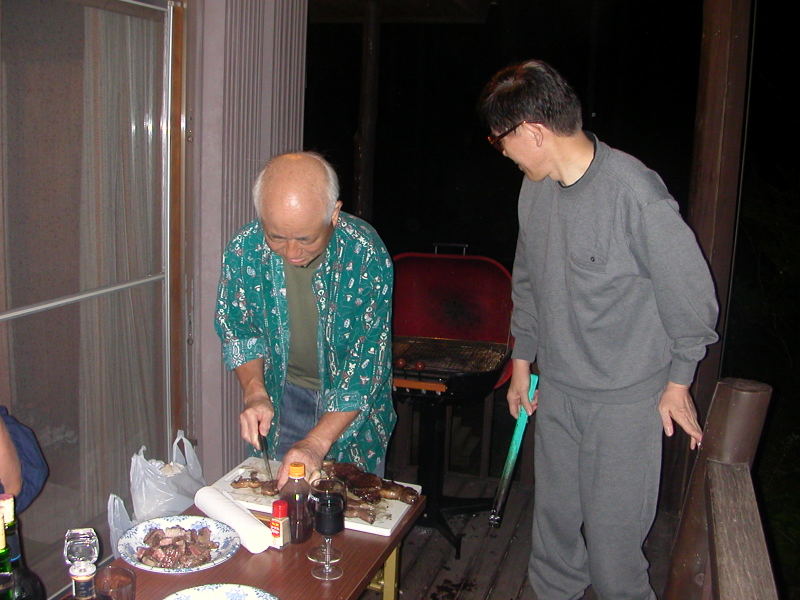 さすがは嘉瀬さんです。ステーキの焼き方はみごとで、その手並はとても洗練されていて、素晴らしく、ふだんの碁でやっている「ちょんぼ」などは、影も形もなく、いっさい、ありま、、、、、いやぁ、ありました。ありました。ちょんぼが、、ステーキを机に移動中に一枚、落としてしまったのです。「あ!」としかし、すぐに、焼き直して消毒し、サイコロ上に切ってまぜて、「これで、わかりゃしないでしょ(^^」と、ちょんぼのあとのリカバリーも最高の職人芸でした。もちろん、サイコロステーキは絶品でした。