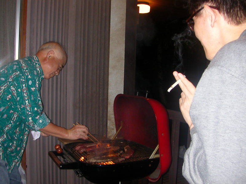 「こりゃあ、うまそうだ!」と、佐藤さん タバコを吸いながら、嘉瀬さんの手際の良さを観戦してます。 |