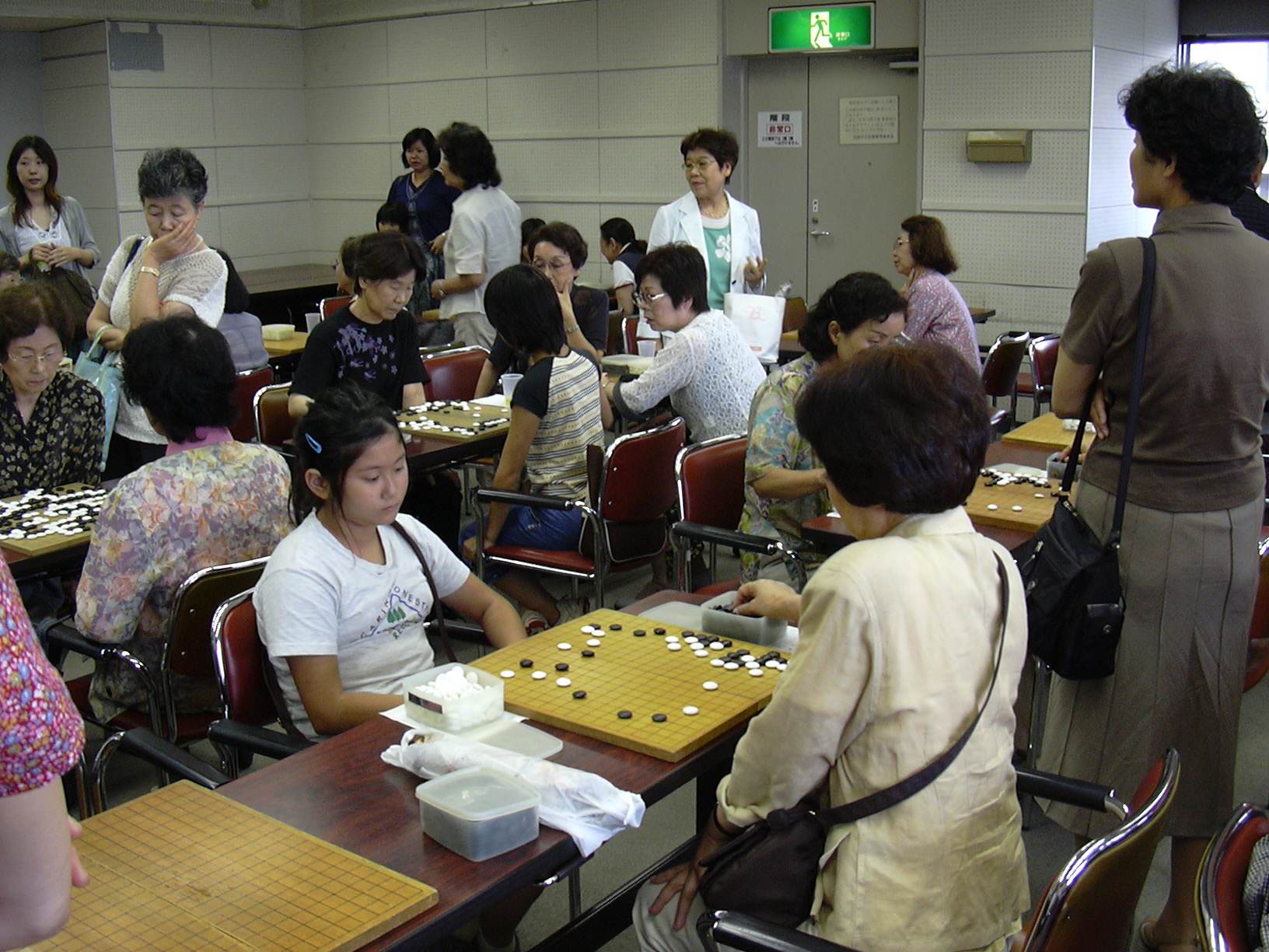 級位者クラスは、毎日先ずプロ棋士の講師による講習が20分ぐらいありその後1時 間40分ぐらい子供同士の対局がありました。講習は布石に関するものと詰碁でし たが、布石に関するものは私が聞いていても大変勉強になる内容で、8000円の受講 料で親子2人が5日間講義を聞いてきたようなものでした。子供同士の対局は、早 い子は1時間40分のうちに10局ぐらい打っていました。子供の碁は、碁盤の中央で 押し合い伸び合いが起こりあっと言う間に中央で左右黒白真っ二つに割れて大きさ 比べと言うのがよく起こりました。