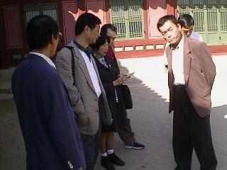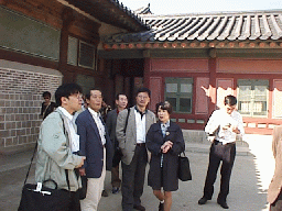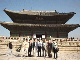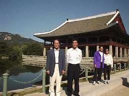 景福宮とは、ソウルに観光にやってきた人がまず最初にいくというほど 観光の名所なんだそうです。車は一路その目的地へむかって走りはじめました。 「井上さんは、どちらの事業所の方なんですか?」 「わたしは六本木になります。皆さんはどういう集まりなんですか?」 「碁の集まりです。」 しばらく、新しくメンバーとなった井上さんとの話が続きました。 しかし、本日の観光を希望されている方が井上さんただお一人とは妙ですね。 「他の連中は今日はどうすごす予定なんです?」「ねてますよ」「は?」 聞くと、昨日は焼き肉のパーティーだったそうだが、そのときの深酒がきいて いたのか大部分の方がお休みになっていらっしゃるそうだ。 韓国にせっかくきたのにもったいないような話ではある。常連なのでしょうか? 車はまもなくソウル一の名所景福宮についたこう漢字で書いて キョンボックンと 発音するから難しい。なるほど名所だけあってなかは観光客でごったがえしている 様子です。中には韓国の昔の史跡や資料コーナーなどがおいてあり、 おもな史跡の前では 写真をとりました。