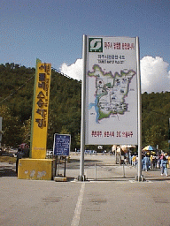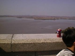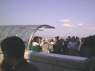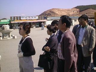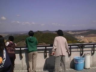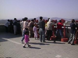 車はふもとにおいて展望台には、バスで行くことになりました。 日曜とあって、かなりの人出でした。 行ってみるとなるほどリムジン川をへだてて よく見ることができます。北朝鮮までは家屋や田畑などがあり生活している 様子があるのです。望遠鏡(有料)があったので、のぞいてみると、、「おお、人が 歩いている!歩いている!」大木さん、と田島さんがさわいでいます。 わたしも見てみましたが、なかなか発見できませんでした。しかし、ついに みつけました。「あ、ほんとだ歩いているよお」 北朝鮮の中の道路で白い服を きている人が歩いています。人が歩いているのをみてこんなに感激したのは初めて。 その後、北朝鮮の人のくらしぶりを写したビデオを見ましたがなんていうか 普通なんですよね。われわれの数十年前のくらしと全然かわりません。 こんな国が飢餓で苦しんでいるとはなんともかわいそうな話です。 そうこうするうちに、北朝鮮のほうからなにやら声が聞こえてきます。 どうやら、かなりでかい拡声器を使用してなにか叫んでいるらしいのですが もちろん意味はわかりません。ガイドさんの話では韓国の悪口をいっている らしいです。また、これは後で聞いた話ですが、あんな場所にあんなに 家屋がたくさんあるのはおかしい。しかもあれだけあって、人はほとんど見えない。 展望台からはよく見えるようにわざと作っているのではないか?との説明がありました。