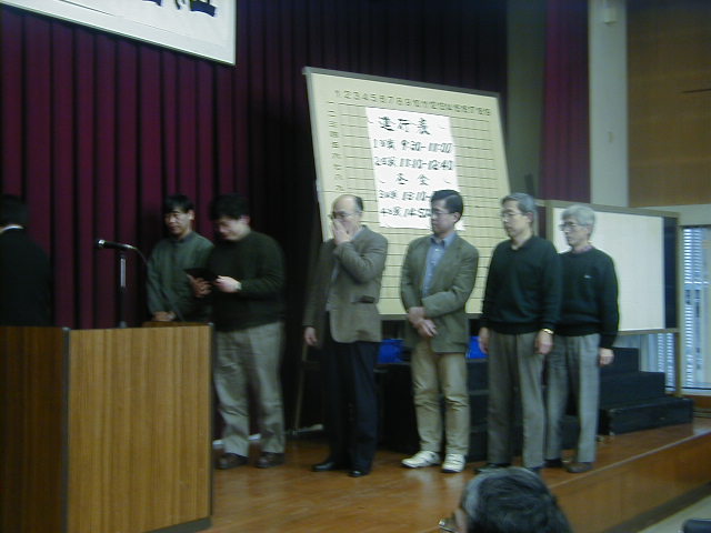 3回戦の強豪、日立との一戦、なんと、7-8でひとつ足りずせり負けて しまいました。これが響いて3位。勝っていた碁を時間でおとした方も いて、痛恨の時間切れ負けとなりました。来年に期待しましょう。