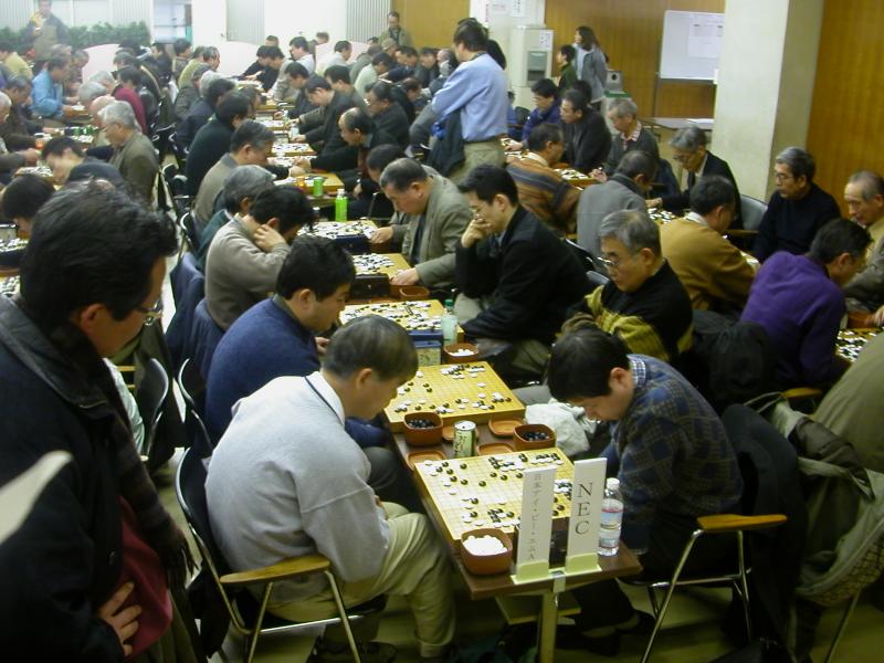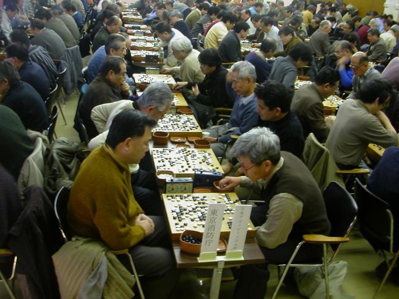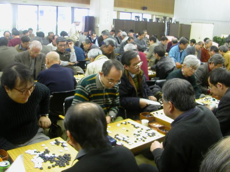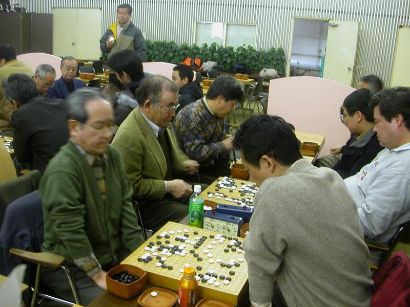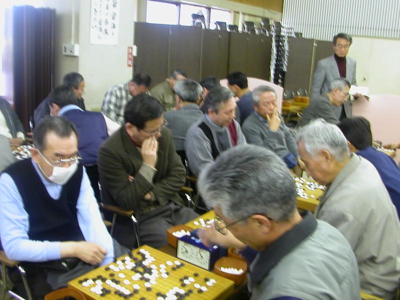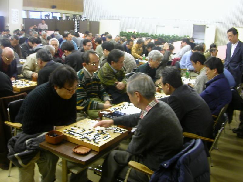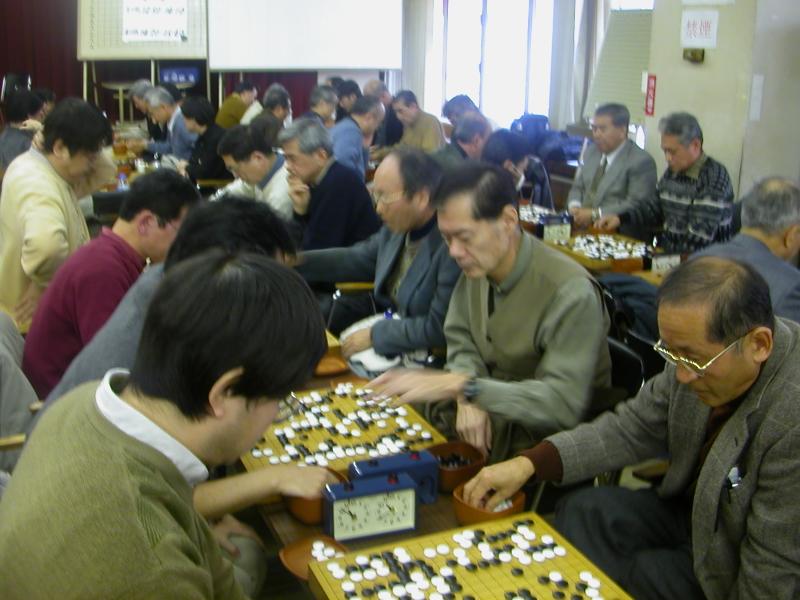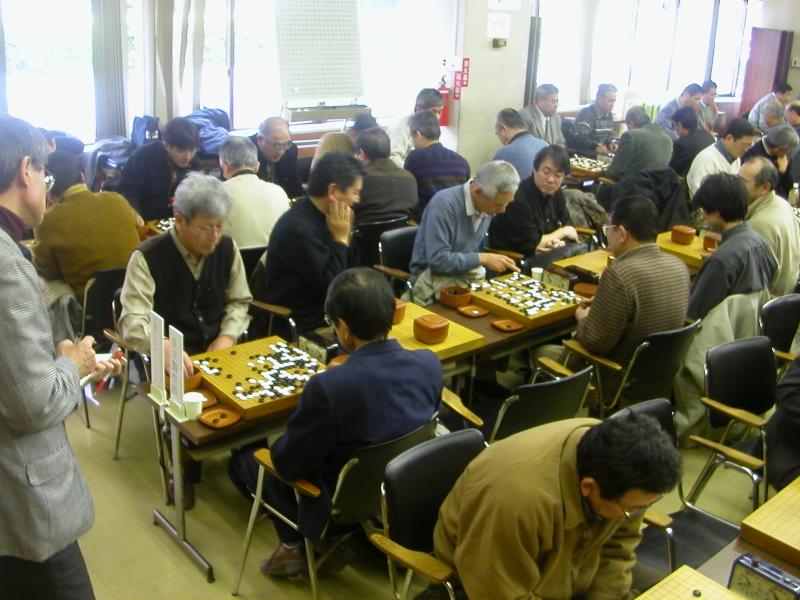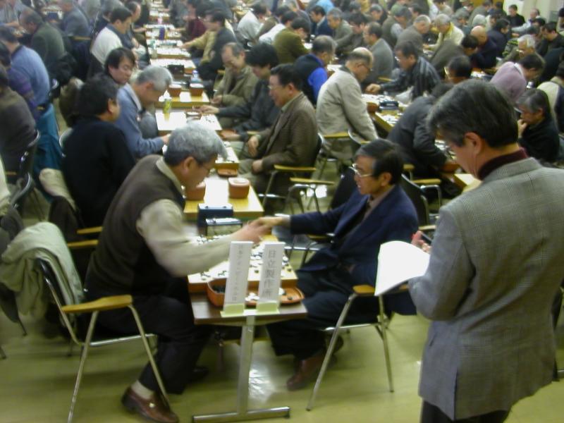 高本さんは終って感想戦。手前、橋口さんは、久しぶりの出場ながら、さすがに強い。 |