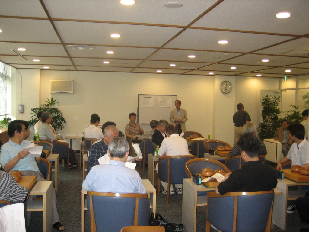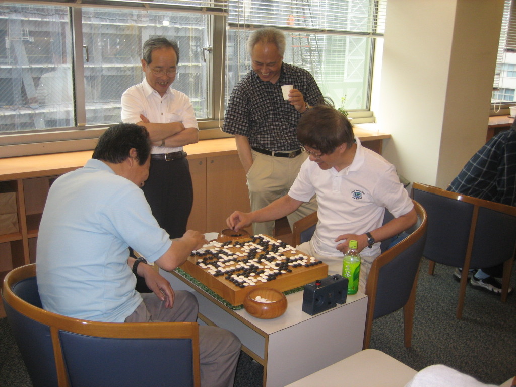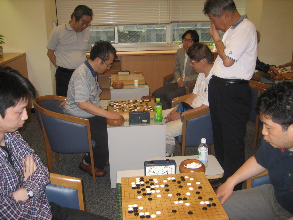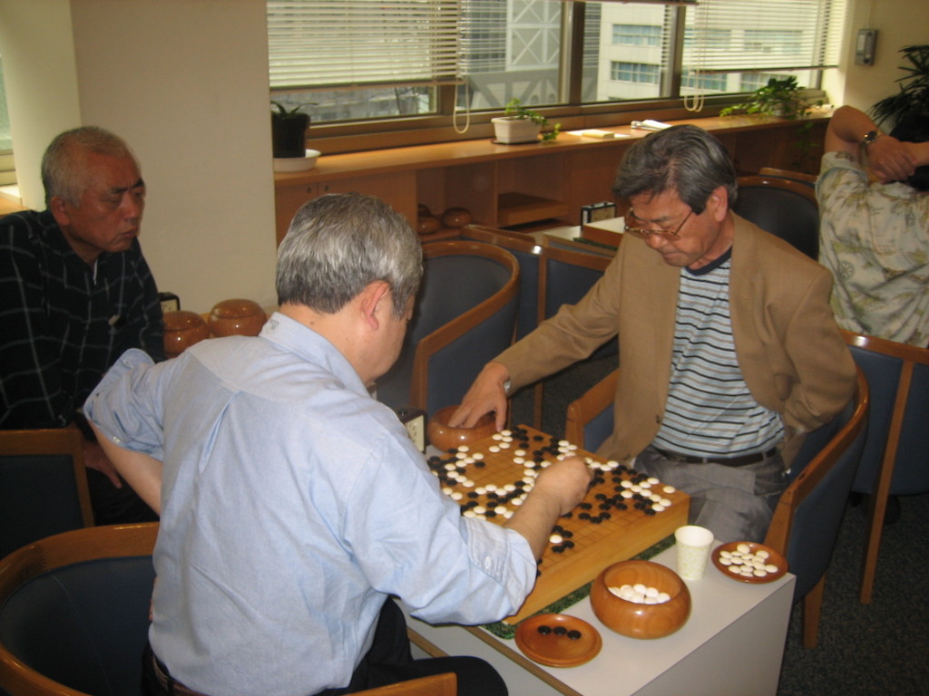 Aクラスの対局、岡野さん(左)と松谷さん 岡野さんはIBM岸原さんと10年以上前に碁会所で1日に4局対局したという縁のある方です。 |