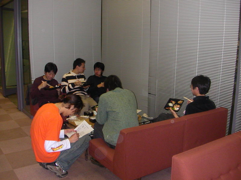 Bクラスは、さすが研究熱心、食事中も研究しています。 |