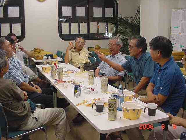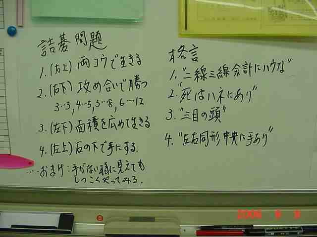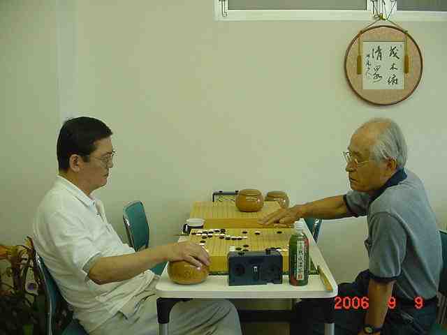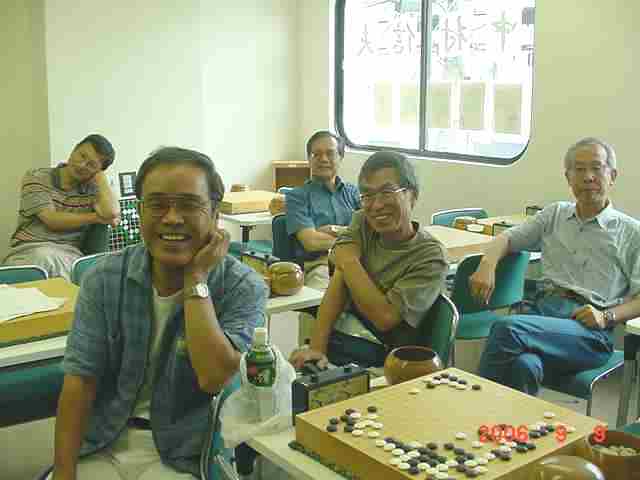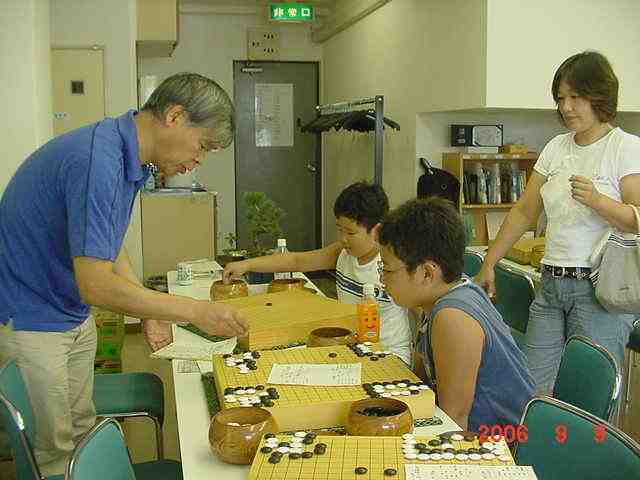 花碁会・月例会 2006年 9月度(第72回)、結果報告 2006/09/09(土) 囲碁道場 中村信夫にて 優勝 瀧さん 4−1 3連続入賞! 2位 古川さん 4−1 花碁会幹事の一員に! 関係ないか(^^) 3位 吉野さん 4−1 兄弟子とともに、あれれ、聞いたフレーズ! 4位 城戸さん 3−2 中村師匠の弟子に仲間入り、これからが楽しみ! 花碁賞 該当者なし 大会模様 定番となりました大会開始前の好評、「花碁ゼミ」、中村さんも毎回 ながら熱が入ります。生徒さんはレンズを向けられると寝てるところ でも撮られたら、あら大変と思わず張り切り、笑いの渦!! 熱心に指導の中村先生と参加者たち
