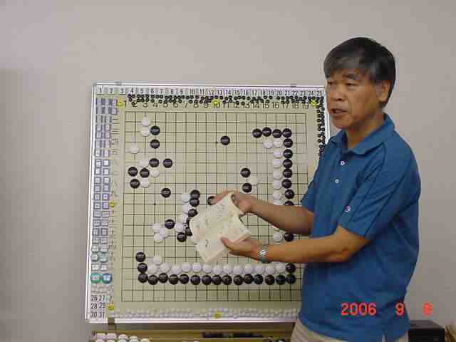 幹事の役得 反省会が終わって帰る間際にも、講義が受けられる! 尼野さんがちょっと質問したら、はいこの通り!! 大会前の「花碁ゼミ」とまではいかないまでも、長く中身の濃い ご指導で「置き碁の必勝法」を授かりました。 碁キチ いやー中村さん、本当に好きなんですねー 碁が!! そして教えることが...(^^、、、、