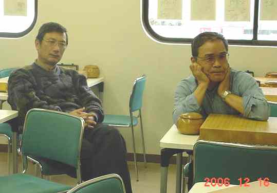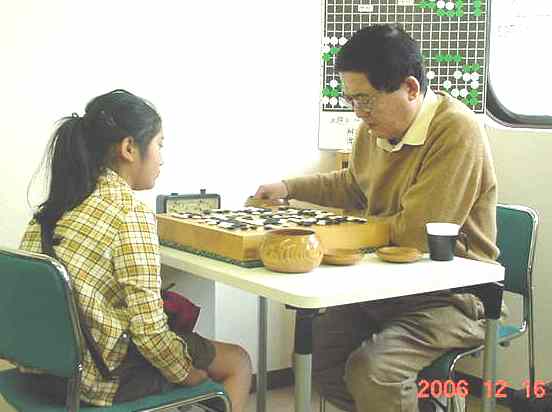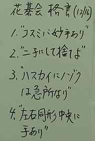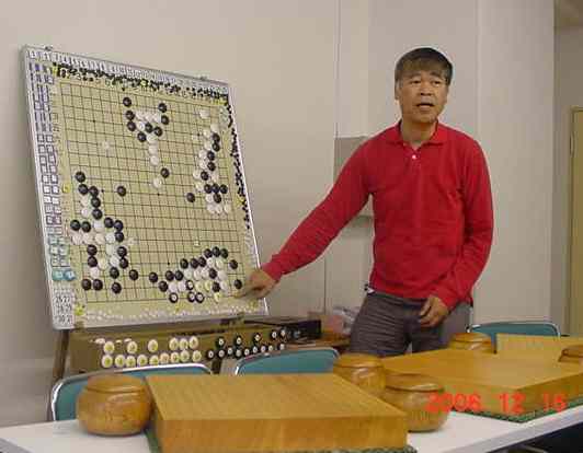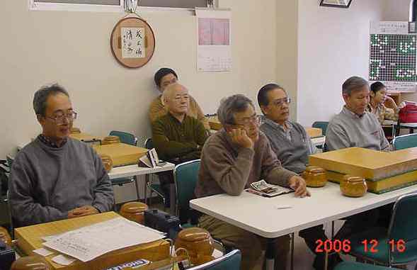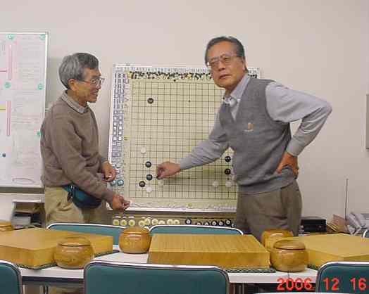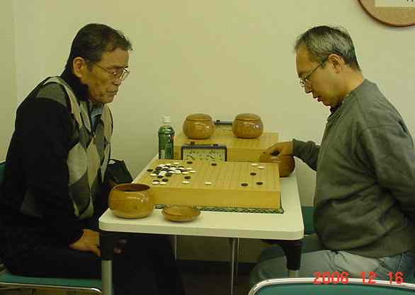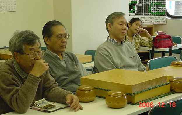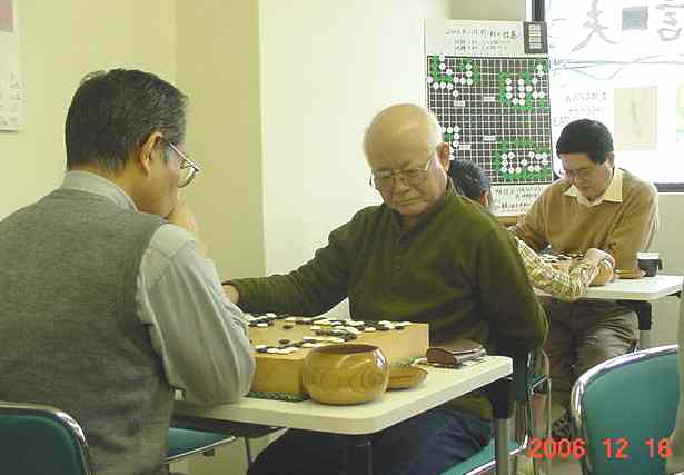 花碁会・月例会 2006年 12月度(第74回)、結果報告 2006/12/16(土) 囲碁道場 中村信夫にて 優勝 佐藤 馨さん 5−0 昇段しても、なお全勝優勝! 2位 聖羅ちゃん 3−2 花碁でも実力示す! 3位 嘉瀬さん 3−2 衰え知らず! 読みもしっかり! 花碁賞 該当者なし 12/16(土)、12月中旬にしては暖かな一日を10人の碁好きが、今年 最後の花碁会を楽しみました、その模様を簡単に報告します。 大会模様 開始前の肩慣らしは、いつもの「花碁ゼミ」から。中村師範もかっこいい!今大会の見所は3つありました。 1.瀧さんの昇段なるか! 2.セーらちゃん、大和優勝のあと花碁では! 3.馨ちゃんの実力は!(藤田さんがこう呼んでいるのでこれからは あたいも親しみを込めて) 瀧さんは5段へあと1点のリーチで時間の問題でしょう。セーらちゃんは 確かに実力がつきました、皆が一様にうならされています。 馨ちゃんは 前回3段で参加されて全勝優勝!今回は3.5段での出場です。その戦いぶり が注目されます。連続の全勝優勝ならまた、昇段していただきます。 さて、2戦を終えて2連勝と飛び出したのは田中、佐藤(馨)、谷野という、 いずれ劣らぬ3人の実力者!!!、最初の一人は季節外れの暖かさに浮かれ たようだ。その後は真の実力を露呈して何てこと無い3連敗(~~、、、、 馨ちゃんだけが3連勝を果たす。そして4戦めの相手はセーラちゃん! ということは、セーラちゃんがここまでいかに善戦してきたかを伺い知る ことができようというもの。ここでも馨ちゃんが遠慮なく(^^、、、勝って 4連勝とほぼ優勝を手中に収めた感!ここで後続をみて驚き、3-1は誰あろう 嘉瀬さんただお一人になっていました。その嘉瀬さん、最終局で馨ちゃんを 破れば....だが、始まってまもなく”ああ〜なにやってんだ僕は〜”と 早々の敗北宣言のような大きな声!!!嘉瀬さん、4局目の対田中戦でも 中盤に入る前に大石の目が無くなって同じ嘆きを聞いたばかりのわたし。 その時には本の問題にでてくるような華麗なさばきで凌ぎ2目勝ちを収めて いた。今度はそううまくはいかせてもらえなかったようだ!馨ちゃんはブッ チギリの全勝優勝で連続昇段となり次回は4段で参加いただくことになりました。 3-2は、セーラ、嘉瀬、瀧、谷野さんの4人が並びましたが全員が勝ち点、 1点差の僅差で見出しの結果となりました。セーラちゃんは見事! 大和大会に続いての入賞となりました。嘉瀬さんは瀧、木村、田中(^^?) というこれまた強豪を破っての3-2で入賞を果たしました。用事があるとの ことで遅くなってしまった表彰式には参加出来ず残念でした。次回参加の 折に賞金を忘れずにお受け取りください。(木村さん、よろしく) スナップ 中村さんに感謝 熱心?に聞き入る参加者、中村師範の毎回の準備に感謝です。