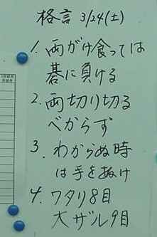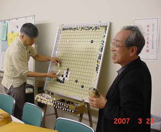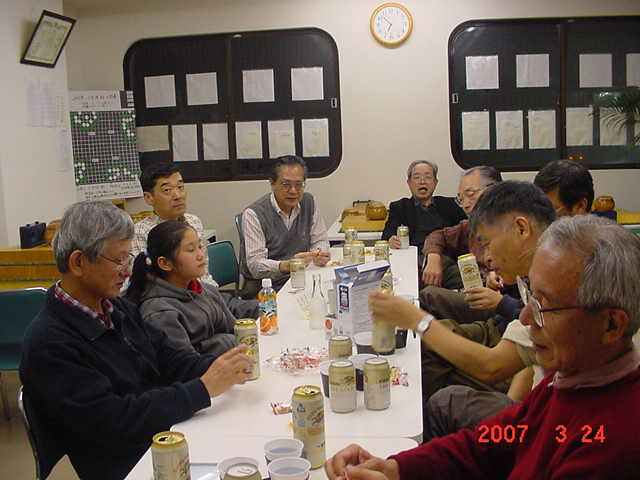 突然の変更 開始前に中村さんから出羽さんの級位変更の申し出を受けました。当初、 3級の予定でしたが、5級に変更されました。中村さんが言うのだから 間違いありません。ところがところが、これが大きな見損じ! 分かっても時すでに遅し。あれよあれよと全勝で優勝をさらってしまい ました。中村さんも見損じを認めたか、曰く、”出羽さん、2階級特進” で次回から3級で参加いただきます。 出羽さん、今後とも花碁会への参加をよろしくお願いいたします。 嬉しい驚き 大会当日会場に着いて驚いたことがありました。中村さんから、今朝、 森さんが ”みなさんで飲んでください”と、ビールを差し入れて置いて いかれました、との知らせ。(参加予定が仕事の関係で欠席に...) 森さんは前回、お見事! 初参加初優勝を飾り大きな賞金(^^、、、を 獲得して恐縮したのか、大会終了後すぐに花碁会参加のお礼メールを いただきました。その中で賞金を”花碁会のために使ってください”との 申し出を受けておりました。早速のご好意ですので喜んでお受けします。 参加者を代表しまして厚くお礼申し上げます。ありがとうございました。 ただし、今回だけということで今後は何も心配なさらすにバンバン稼いで 車の購入資金にでもあてていただけたらと思います。ははははは太っ腹! 何!ただのメタボリック シンドローム症候群! おーダイエットしなきゃ! 楽しく有意義な反省会 打ち碁をみていただきました。古川さんと田中さんは3/13(火)木村さんと 3人で一緒に指導碁を打ってきました。玉城 忍6段との棋譜を並べてたく さんの指摘をいただきました。