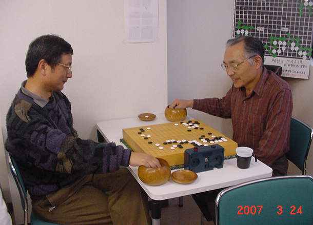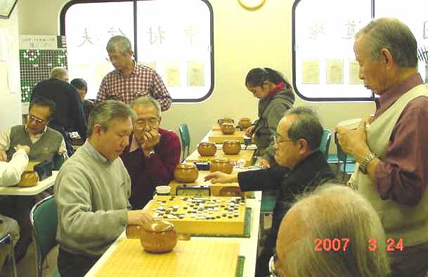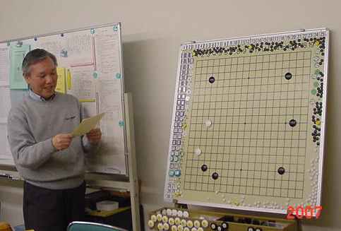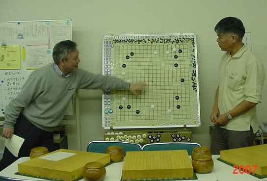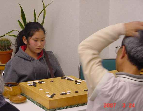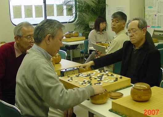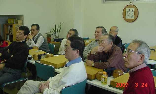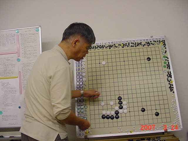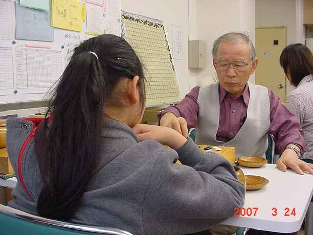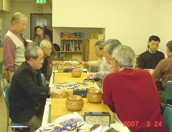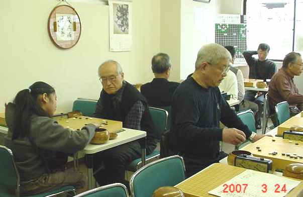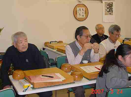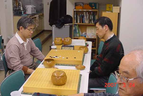 花碁会・月例会 2007年 3月度(第77回)、結果報告 2007/03/24(土) 囲碁道場 中村信夫にて 優勝 出羽さん 5−0 初参加を全勝優勝で飾る!席亭の見損じ? 2位 城戸さん 4−1 実力者を破って2位入賞! 3位 木村さん 3−2 やっぱり実力がついていた! 4位 谷野さん 3−2 連続入賞! 幹事が火を付けてしまったか! 花碁賞 池田輝夫さん 久しぶりに出てきたのに(^^、、、、 桜、開花の中での花碁会を期待したが寒の戻りで文字どおりの花碁会 とはならなかった。それでも、可愛いセーラちゃんの参加で花一輪が 会場を和ませてくれました。今回も奇数になりそうだったが中村さんの 紹介で出羽誠三さんの初参加をいただき14人の偶数で開催出来ました。 出羽さんは3級でお願いします、と中村さん。 参加者14人で一クラスというのは一番厳しい参加人数です。参加申込 しながら都合で参加出来なくなった前回の覇者、森さん、そして久々の 参加予定だった安田倉庫梶@村松さんのお二人が参加していたら、2ク ラスが実現していたかと思うと少し残念な思いもするが楽しみを残して おくのも悪くない。 花碁会段位 花碁段位は真形杯段位からリンクします。ただし、花碁段位は真形杯 段位にリンクしません。(^^、、、、 それで今回から、セーラちゃんには、1級に昇級していただきました。 今大会の見所 初参加の出羽さんの戦いぶりは? 1級に昇級してセーラちゃんは! 5段昇段にリーチをかけたままの瀧さんは! 古川、谷野という強豪 コンビはまだまだ続くのか! 久々に参加の池田輝夫さん、高本さん、 吉野代旨男さんらは...等々楽しみの多い大会です。 中村信夫の花碁ゼミ 定石となった大会開始前の好評、「花碁ゼミ」 今回も盛りだくさん。大会模様 初参加の出羽さんは、5級で臨みました。これは台風の目になりそう。 第3戦、2連勝した4人の組み合わせは、谷野−尼野、城戸−出羽。 谷野、出羽さんが勝って第4戦での激突となりました。出羽さんが 勝ち残って最終戦に全勝優勝をかけて強豪、瀧さんに挑戦しました。 これにも勝利して初参加を全勝優勝で飾りました。 城戸さんは3戦目に出羽さんに敗れたものの、村田、高本、吉野(代)、 谷野さんと実力者を次々と撃破して4−1と立派な2位入賞を遂げた。 続く3−2は、谷野、セーラ、尼野、瀧、木村さんら5人が並びました。 新勝ち点の計算で見出しのようになりました。谷野さんは先月の結果 報告記で ”花碁会再開しての初入賞”に奮起? で連続の入賞です。