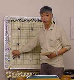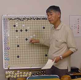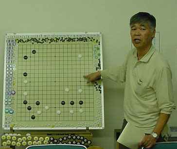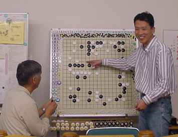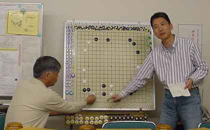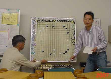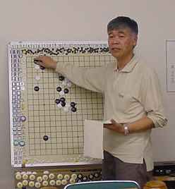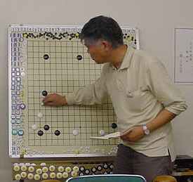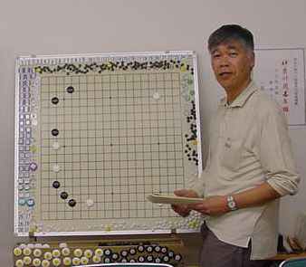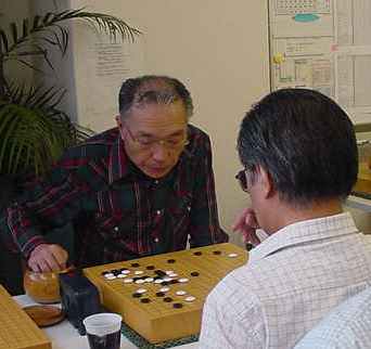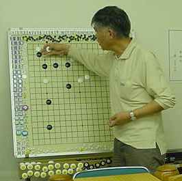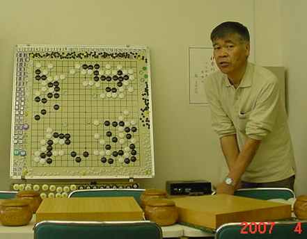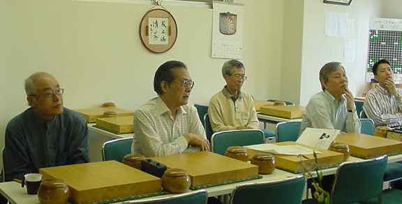 2回戦(同上) 田中-尼野、森-古川、瀧-石田、城戸-木村。 田中、森さん2連勝。 2戦を終えたところで昼食の一服 たまたま連勝したものだから、お昼ごろからみなでつるんだように 幹事を持ち上げる...(^^、、、”田中さん強くなったよねー”、 ”いやいやもともと強いんだよ”何を錯覚したか、すっかりその気に なってしまった田中さんは本気で優勝狙いに切り替えた。(XX) 3回戦(同上) 田中-森、尼野-瀧、城戸-石田、古川-木村。あれれ田中さん3連勝! 森さんは終盤、碁石を静かに置いて ”ありません”と投了されま した。わたしはそう悪くはないが勝っているとも思っていなかった。 森さんに確認すると終盤前にわたしの打った割り込みから2子を取 られて負けとのことだった。そこから最後のヨセまで打って確認する と、わたしの1目勝ちだったがヨセ勝負としたらわたしの負けでした。 森さんの潔さで勝たせていただきました。潔さと云えば木谷さんを 思い出しました。木谷さん、たまには花碁に遊びに来てね(^^、、、 尼野さんは苦手といっていた瀧さんに勝利しました。 4回戦(同上) 城戸-田中、尼野-古川、森-瀧、石田-木村。田中さん敗れて3勝が、 田中、城戸、尼野、森さんの4人とまったく分からなくなりました。 最終局(同上) 城戸-尼野、森-石田、古川-田中、瀧-木村。残念ながら田中さんが 3勝者全員と既にあたっているため3勝どおしの組み合わせには出 来ず、上の組み合わせとなった。城戸さんは緒戦を落としたが以降 4連勝してお見事!逆転優勝を果たしました。これで勝ち点を8と して4段昇段にリーチをかけた。森さんは2月の初参加(5.5段) でいきなり優勝を遂げて今回は飛び付け6段のようなもの。 それでも、このとおり4-1とまだまだ実力のほどは不明。今後の 活躍が楽しみであり、見ものです。田中さんは実力を露呈した格好。 それでも久し振りの入賞にすこぶる喜んぶのであった(^^、、、