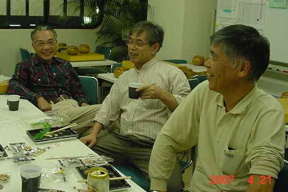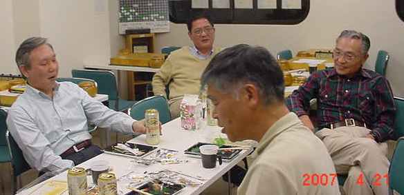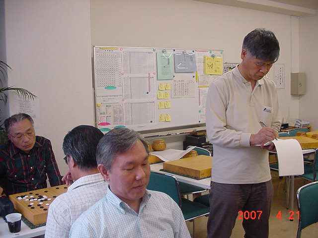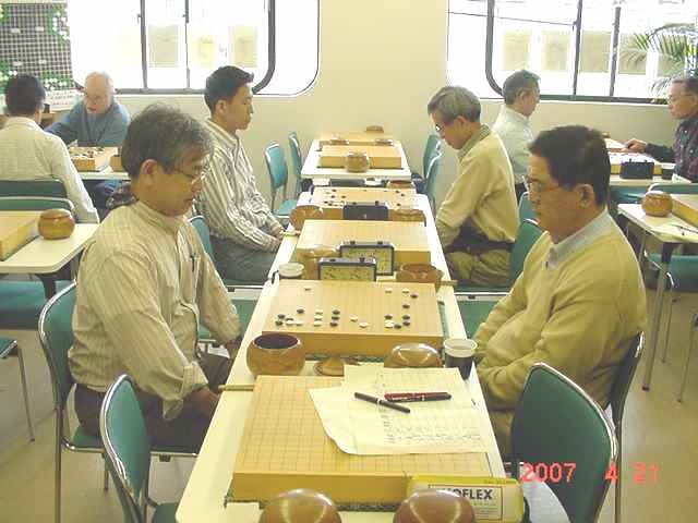 花碁会・月例会 2007年 4月度(第78回)、結果報告 2007/04/21(土) 囲碁道場 中村信夫にて 優勝 城戸さん 4−1 連続入賞で4段昇段にリーチ! 2位 森さん 4−1 6段に昇段しても、このとおり! 3位 田中さん 3−2 出だしは上々、尻すぼみ! 花碁賞 木村 毅さん 久しぶりの受賞(^^、、、、 くるくると変わり、そしてぐずついた天気が続いていた中にあって 大会当日も、はっきりしない天気でしたがちょっと汗ばむ一日でした。 その日、道場の窓を開け放し湘南の風を感じながら、参加者は一生懸 命に打ち、食い、飲み、そして学びました。 参加者は8人と少数ながら、2Kから6Dまでと幅広い棋力のいずれも 劣らぬ豪腕自慢の面々、はてさて結果はいかに..... 中村信夫の花碁ゼミ 大会開始前の好評、「花碁ゼミ」 中村師範の熱心な講義に感謝。大会模様 いつものように順位と緒戦の組み合わせは抽選で決定。その後は勝者 どおしを順位の上から組み合わせていく。 緒戦の組み合わせと結果(左側が勝者) 田中-瀧、尼野-石田、古川-城戸、森-木村。尼野さんガンバッテる!