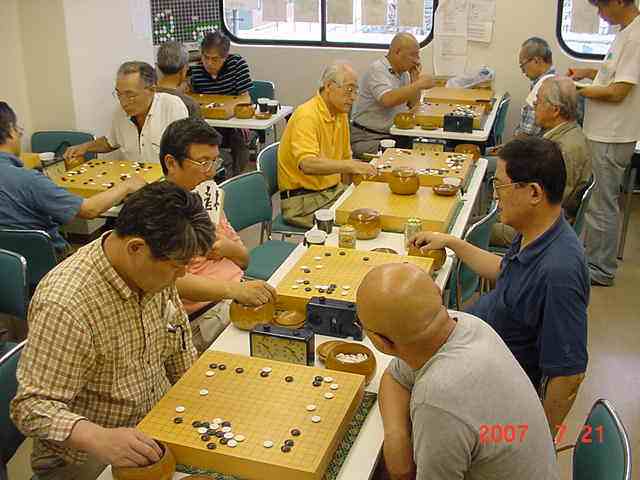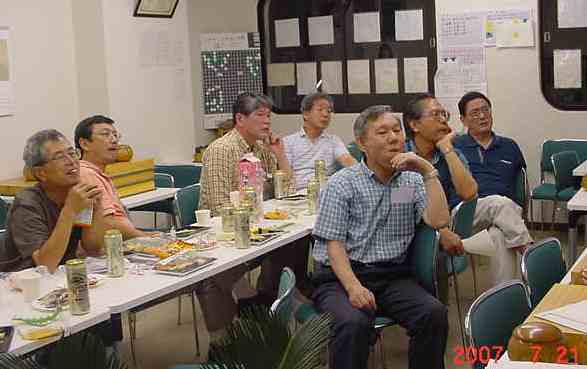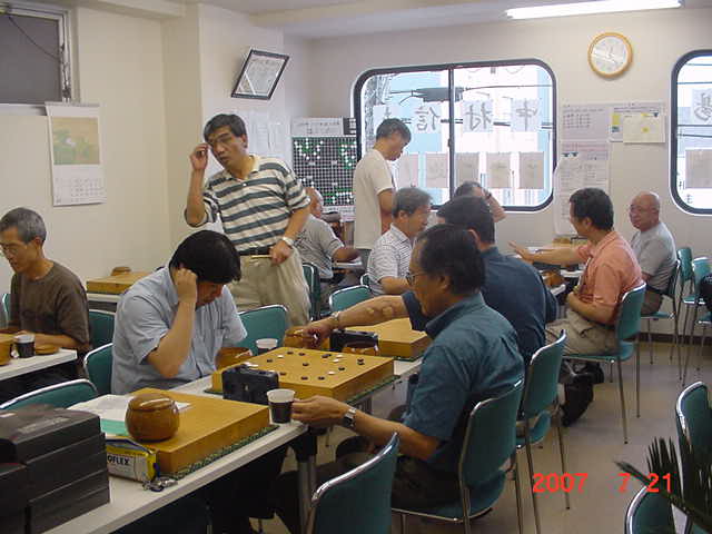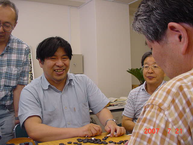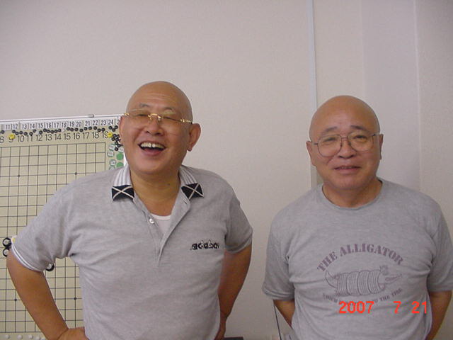 花碁会・月例会 2007年 7月度(第81回)、結果報告 2007/07/21(土) 囲碁道場 中村信夫にて Aクラス 優勝 古川さん 4−1 時間も克服して優勝! 2位 瀧さん 4−1 前回の優勝に続き2位入賞! 3位 佐藤馨さん 3−2 4段に昇段しての参加で! 花碁賞 蓑田さん 豪快な負けっぷりで初参加・初受賞(^^、、、 Bクラス 優勝 石丸さん 4−1 初戦を落とすも、4連勝で! 2位 外山さん 4−1 初参加で お見事2位入賞! 3位 城戸さん 3−2 4段昇段、おめでとうございます! 花碁賞 該当者なし ダンダンダン! 耳を打つドラムの音に驚き、道場の窓越しに外 を覗くとマーチングバンドやバトンフラワーのパレードが続く。 そんなお祭りムードで、なんとなく落ち着かない中で開始しました。 (交通安全か何か町のお祭りのようでした) 今回も中村席亭(ある時は席亭で、またある時は先生として講義、 はたまた師範として打ち碁の指導とおんぶに抱っこ)の紹介で新たに 蓑田矩仁起(みのだくにおき)さんと外山洋平(とやまようへい)さ んのお二人が加わった。だいたい席亭もみなさんの力関係を把握され た様子でそれぞれ四段と二段の推薦となりました。参加者のみなさん からはお二人ご兄弟ですか?と質問が飛ぶほど雰囲気が似ている。 明るく(^^!どこが? 快活で楽しいお二人で会が大いに盛り上がり ました。今後も継続して参加をお願いします。 参照 添付写真。 本当に似てるでしょ!? (See attached file: 初参加の蓑田さんと外山さん.JPG)さらに関東囲碁部のエース! タッチゃん(こう呼ぶのわたしだけかい) こと岸原達也7.5段の久々の参加もありました。 タッチゃんはみなさんご存知のとおり、関東囲碁部はこの人を抜いては 語れません。関東囲碁部WEBサイトの開発/管理をはじめ、部活動の 多くの部分で先頭に立って活躍されています。その働きには感謝です。 碁の実力でも今やトップクラスに成長され、部員を驚かせています。 ちょっと持ち上げすぎ? あっ! いゃ! 本当ですよ(^^。。。。。