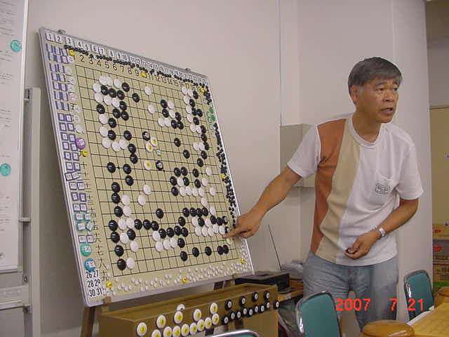 初参加の蓑田さんと外山さんタッチゃんには参加申し込みのおり、Bクラスに入り(ただし持ち時間 30分)、指導碁のように局後、打ち碁を見てもらうようお願いしました。 先の紹介にこの指導の役割も含めておかねばなりません。過去にも花碁 会では何度もこうした参加をお願いして来ました。さらに毎回参加いた だくと嬉しいのですが....まっ関東囲碁部のたくさんの仕事で忙し いので出来る範囲で今後もよろしくお願いします。 なお、自戦感想戦記もお願いしましたが忙しいので今回は勘弁してとの ことでしたが、大会終えてすぐにいただいておりましたので添付しまし た。どうぞお楽しみください。きっと日本代表がPKで勝ったので気分が 良かったのでしよう(^^、、、、 Bクラスのすぐあとです。 あっ、そうそう午後には、前回二位入賞された藤田パパが遊びに来てく れました。田中さんは撮っているだけなので写しましょうとカメラマン をしてくれました。ありがとうございました。 花碁ゼミ 花碁会に参加するのは、この中村さんの講義が聞きたいのでという方も 大勢おられます。講義だけでなく多くの対局を記録していて昼休みと反 省会のおり、大事な場面での一手を教えていたたけけるのも有意義です。