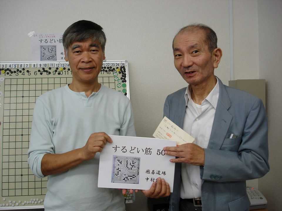 花碁会・月例会 2007年 10月度(第84回)、結果報告 2007/10/20(土) 囲碁道場 中村信夫にて Aクラス 優勝 谷野さん 5−0 いょっ! 関東囲碁部・部長! 2位 瀧さん 3−2 5.5段に昇段してもこのとおり! 3位 古川さん 3−2 対、森戦(1回戦)の一勝が物を言い! 花碁賞 該当者なし Bクラス 優勝 田中さん 4−1 おだてに乗っちゃいました! 2位 外山さん 3−2 凄い! 参加大会をすべて入賞! 3位 岡田さん 3−2 3段に昇段してもこのとおり! 花碁賞 該当者なし 昨夕からの雨も上がり、すがすがしい日となりました。秋のおだやか な一日を16人の碁好きが集まり大会を楽しみました。 今回も中村道場から初参加がありました。小堀勝亮さん(4段での参加) で中村さんから次の情報がありました。 小堀さんはわたし(中村さん)が林先生と誠文堂新光社主催で3子で打 ち、6目勝ち(1998)をした時の観戦記を書かれた方です。武宮正樹九 段を非常に良く知っている方で単行本等も出版されております。 わたしも挨拶したおり、 ”4段なんてことないんでしょ!” と質問 したところによると、以前はアマでも強豪の打ち手だったようです。 病気(脳いっ血で今でも半身不随)してかなり弱くなってしまいました とのことでした。碁ライター出身の方が参加するとは、花碁会も凄いこ とになりました。中村席亭と仲良くポーズの初参加の小堀さん 手には製本も計画中の『するどい筋 50』これは中村道場の講座で扱 った実戦からのよく現れる代表的な手筋をまとめたものです。製本前に も中村先生特製(写真に写っているもの)のものを2000円で求める ことが出来ます。購入して覚えると3子は強くなります。これは、あく までも ”覚えると” ですからお間違いのないように。講座でもこの 話が取り上げられました。どの筋かを選択することが考慮時間の使い方 とのこと、本番で手を読んでいては時間がいくらあっても足りない。 碁は会話です、筋はその言語で会話の中心と言うわけです。