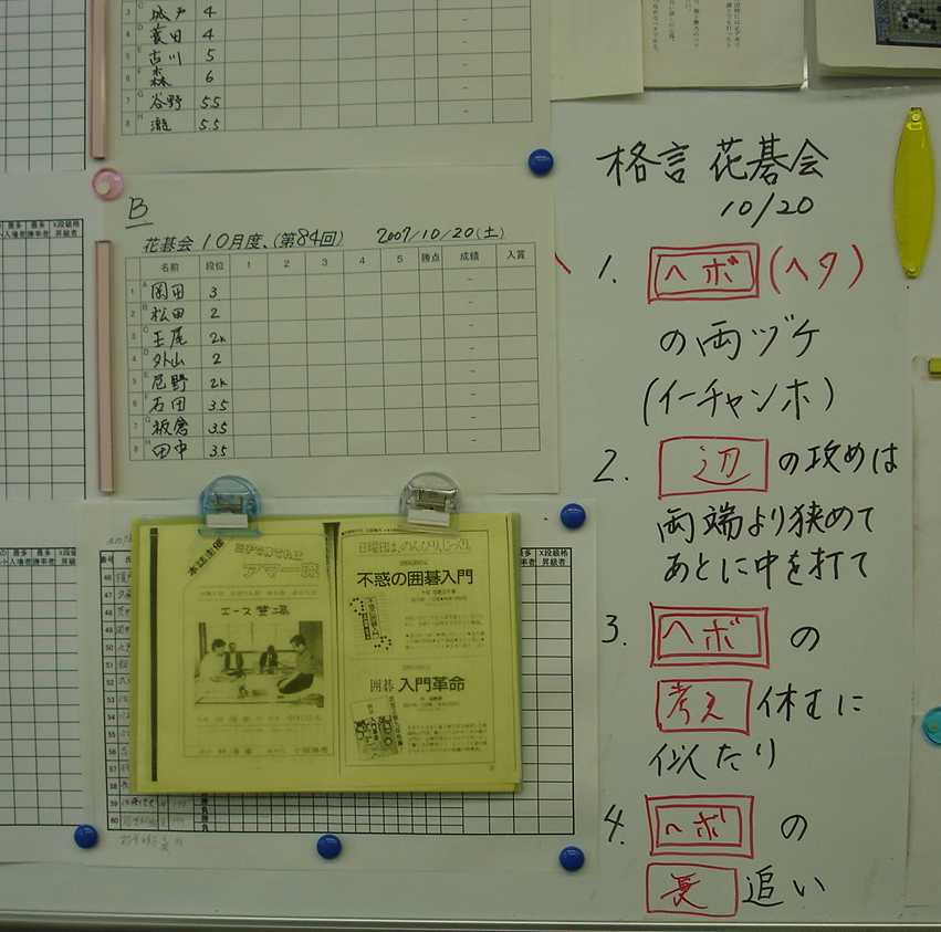 初参加_.小堀さん花碁ゼミ 大会開始前の好評、「花碁ゼミ」 今日は死活のいろいろな筋を教わり ました。格言と先に紹介した小堀さんが観戦記を書かれた本のコピー(左)