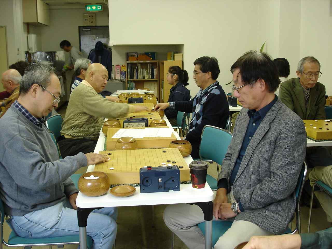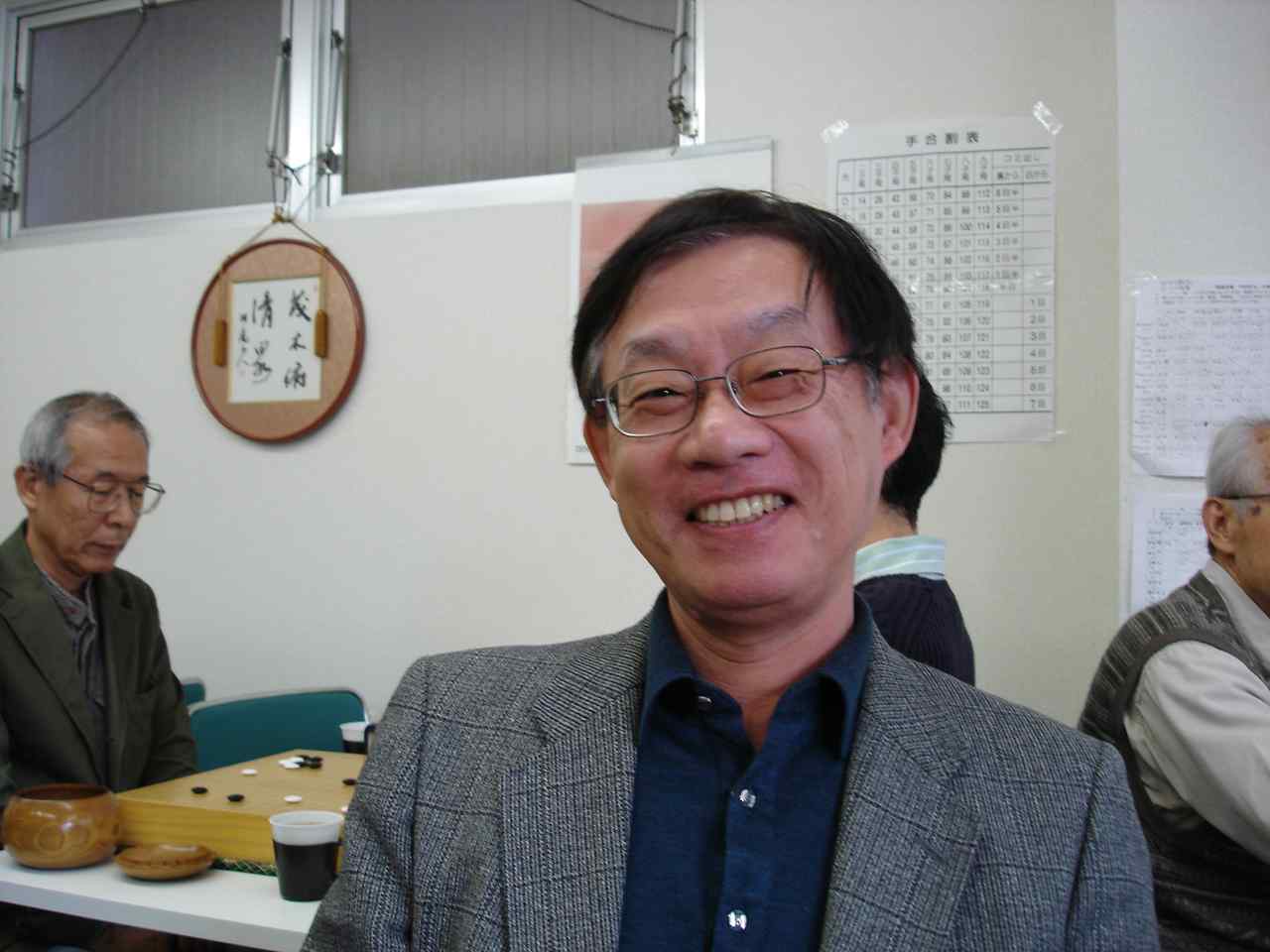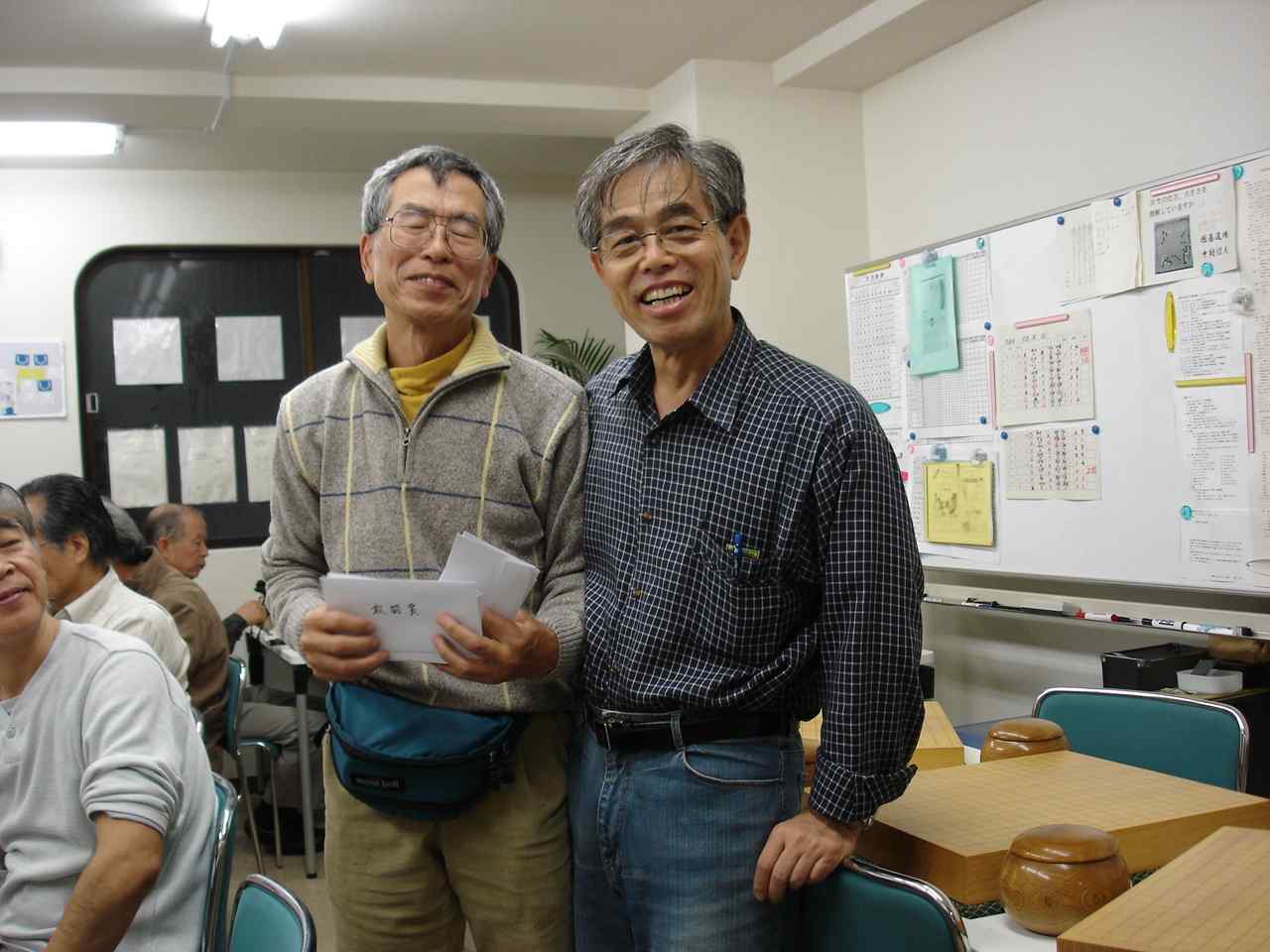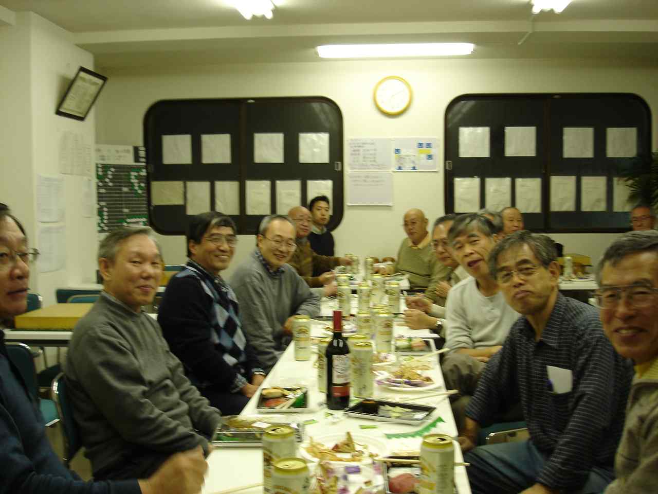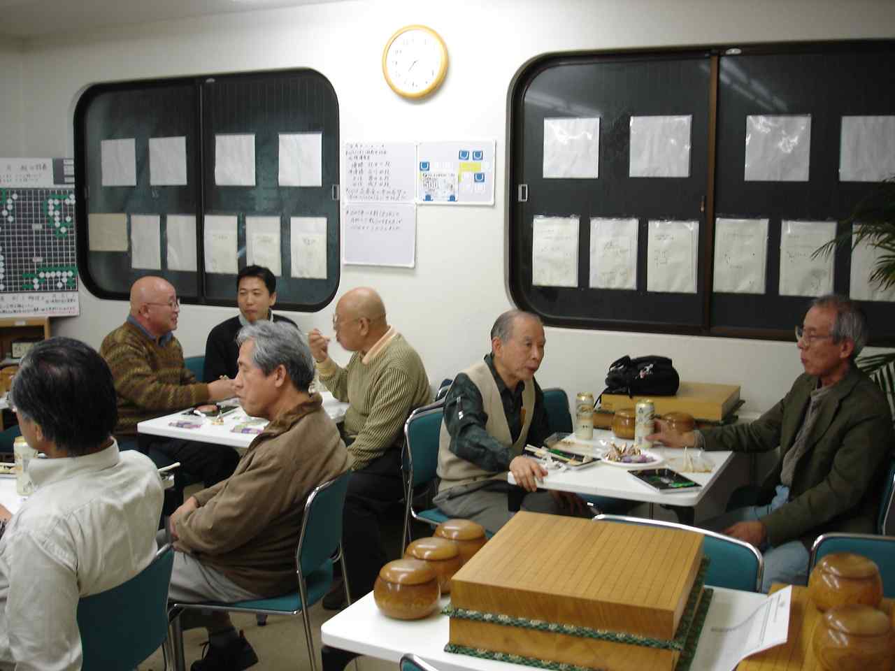 花碁コンビ入賞楽しい反省会 反省会はアルコールが入って毎回楽しくガヤガヤとやります。 次回、12月の中村花碁会は12/15(土)に開催予定です。 追伸 嬉しいことに、多くの方々から花碁会終了を惜しむ声をいただきました。 前回(10月)の反省会のおりにも、そのことが話題になったようでした。 中村席亭が継続を考えているとお聞きしていましたので、個人的に前もって 相談しました。出来たら形を変えても花碁会の名前を引き継いで継続したい 旨をお聞きすることが出来ました。そして、中村席亭を中心にみなさまのご 意見をお聞きしながら次のようにまとまりましたので、ご案内いたします。 名称 :中村花碁会 開催日 :毎月、第三土曜日 9:55集合、10時開始 定例会としますので、開催の案内はありません。 *参加したい方は、一週間くらい前までに電話にてお申し込み ください。会場の都合で参加人数を把握(目安)するためです ので大会当日、不参加でも結構です。 電話 : 0466−44−6763 場所 : 「囲碁道場 中村信夫」 内容 :当日、集まった方による大会を開催します。 *特にIBMのみなさま(退職者を含む)の参加を よろしくお願いいたします。 道場のお客様も自由に参加できます。 大会形式はいくらか変更されるようです。 大会開始前の花碁ゼミ(20分程度)は、 これまでのように開催されます。 参加人数や段位を考慮してその時に最適な 大会にしていきたいとのことですので、 いろいろな楽しみがあるようです。 例えば、無差別クラスの開催等。 参加費用:1500円 通常より格安で参加出来ます。 注意 昼食のお弁当は各自、持参ください。 なお、食べ終わった容器についても各自持ち帰ってください。 ・含む 会場費、賞品代等 *会場での暖かい飲み物、 これまでの花碁会同様、みなさまの積極的な参加をよろしくお願い申し上げ ます。 最後に、長きにわたり、花碁会に参加していただきましたみなさま、楽しい 碁会をご一緒に過ごすことが出来ましたこと、心から感謝申し上げます。 ありがとうございました。 Thank you ! ●○● IBM-Japan TSOL、サービス推進・部品オペレーション ○●○ 入出庫業務 , 田中啓一 Mail Code = HQ−AUYA2−B TEL 03-3769-6742, 1246-6742 FAX 03-3769-6773
