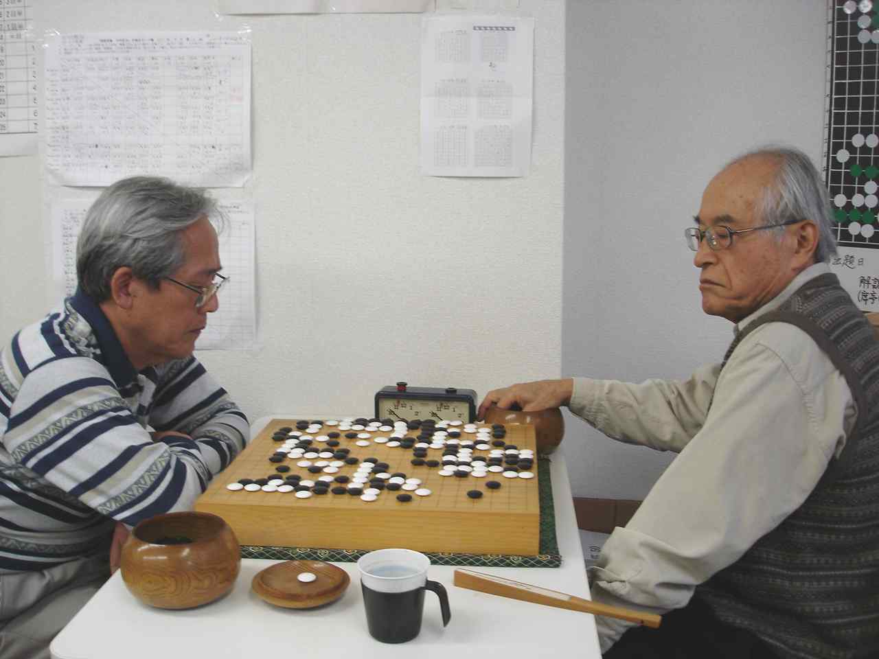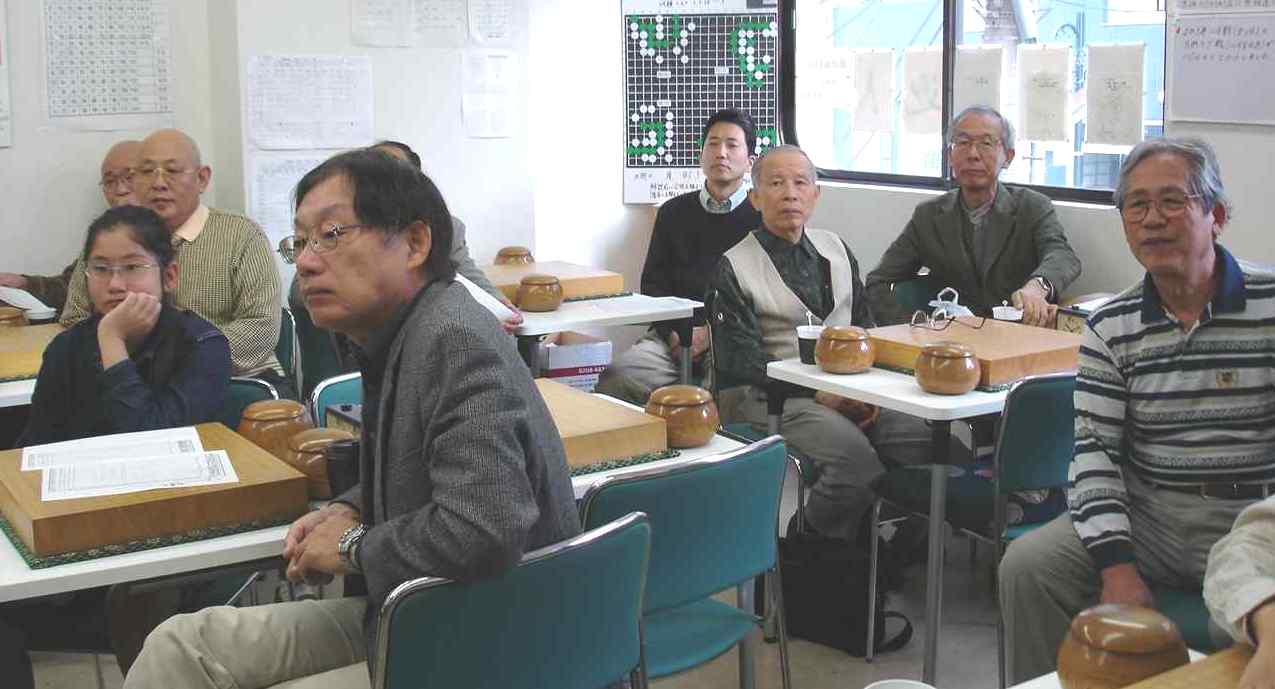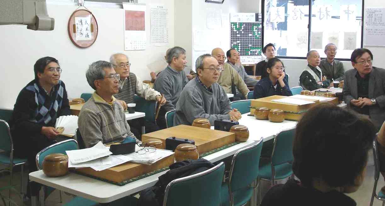最後だからと参加の池田輝夫さん花碁ゼミ 大会開始前の好評、「花碁ゼミ」 聞き入る参加者たち 大会模様 さて、16人の参加でしたので通常なら2クラスですが、今回は最後と いうことで1クラスのオープン戦で楽しみました。入賞は1位から3位、 そして、勝ち越しした方は全員入賞(敢闘賞)としました。 一回戦の結果、左側の方が勝者です。 聖羅−嶋澤、 石田−岡田、 池田−外山、 田中−古川、 尼野−木村、 蓑田−王尾、 森−村田、 久野−佐藤馨。 二回戦の結果、左側の方が勝者です。 聖羅−石田、 池田−田中、 尼野−蓑田、 森−久野、 嶋澤−岡田、 外山−古川、 木村−王尾、 佐藤馨−村田。 2回戦を終えて連勝は聖羅、池田輝夫、尼野、そして、森さんの四人。 この四人が3回戦で星のつぶしあい。聖羅−池田戦、尼野−森戦で、聖羅 さんと森さんが三連勝、4回戦でこの二人が激突。勝った方が優賞をぐっと 手元に引き寄せます。この大事な一戦、どうやら聖羅さんが勝ったようです。 反省会のおり森さん曰く、”おとうさんが対局の間、傍でずっーと見守って おられたので二人と戦っては勝てませんでした”(^^、、、、