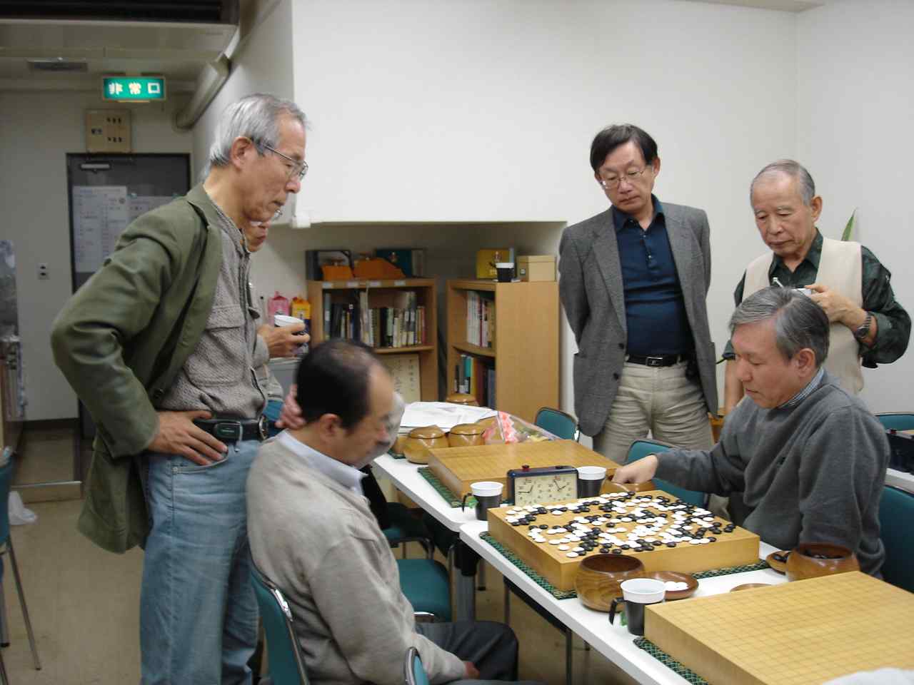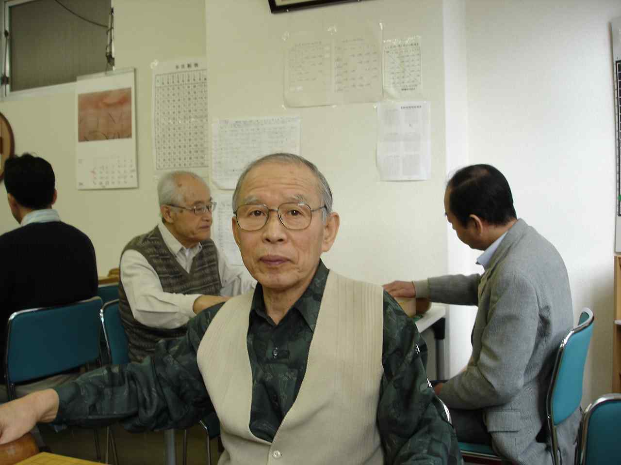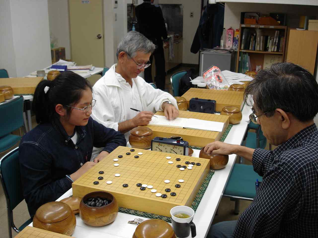 最後だからと参加の池田輝夫さん花碁ゼミ 大会開始前の好評、「花碁ゼミ」 聞き入る参加者たち 大会模様 さて、16人の参加でしたので通常なら2クラスですが、今回は最後と いうことで1クラスのオープン戦で楽しみました。入賞は1位から3位、 そして、勝ち越しした方は全員入賞(敢闘賞)としました。 一回戦の結果、左側の方が勝者です。 聖羅−嶋澤、 石田−岡田、 池田−外山、 田中−古川、 尼野−木村、 蓑田−王尾、 森−村田、 久野−佐藤馨。 二回戦の結果、左側の方が勝者です。 聖羅−石田、 池田−田中、 尼野−蓑田、 森−久野、 嶋澤−岡田、 外山−古川、 木村−王尾、 佐藤馨−村田。 2回戦を終えて連勝は聖羅、池田輝夫、尼野、そして、森さんの四人。 この四人が3回戦で星のつぶしあい。聖羅−池田戦、尼野−森戦で、聖羅 さんと森さんが三連勝、4回戦でこの二人が激突。勝った方が優賞をぐっと 手元に引き寄せます。この大事な一戦、どうやら聖羅さんが勝ったようです。 反省会のおり森さん曰く、”おとうさんが対局の間、傍でずっーと見守って おられたので二人と戦っては勝てませんでした”(^^、、、、