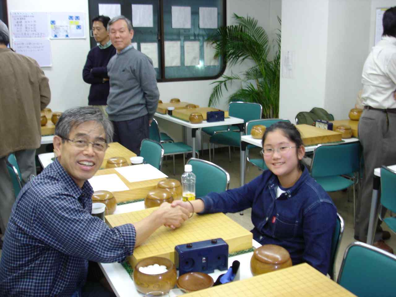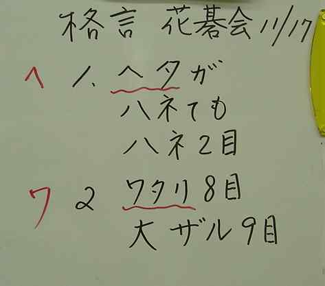 花碁会・月例会 2007年 11月度(最終会、第85回)、結果報告 2007/11/17(土) 囲碁道場 中村信夫にて 優勝 聖羅さん 5−0 向かうところ敵なし! 初段認定! 2位 森さん 4−1 パパの熱心にやられたと(セーラ戦を落として) 3位 石田さん 4−1 パパの観戦は無かったのに完敗と!(セーラ戦) 敢闘賞:勝ち越し者は全員入賞、全員が3−2でした 外山、田中、木村、久野、佐藤馨さんの5人 花碁賞 該当者なし(16人もいて全敗者無しとはスゴイねー) 賞品を準備していなかったので心配でした(^^、、、 誠に残念ですが最後の、花碁会・結果報告となりました。 最後の花碁会に初参加を果たした、大和大会常連の久野慶三さん。 藤田さんに段位推薦を依頼した折、インパクトの久野さんですからとの 紹介があったとおり、最後の大会に初参加とは印象に残りました。 神野さんと互先とのことで3段でお願いしました。