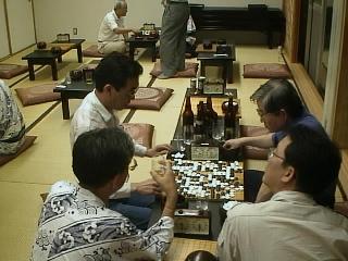 (高本さんは、この最終戦(対国分戦)に「勝って負けなしで優勝!」 の偉業を達成しました。この快記録をひとめ、見ようとする観戦者 も対局者同様真剣な表情でした。) この圧勝ぶりには、合宿内にも高本さんのファンが急増し、「あのような おちついた打ちぶりを身につけたいものだ。」と感心しきりでした。 某氏の分析によると、高本さんは好不調の波が激しいそうです。 Bクラスの新名さんは、終始安定したうちまわしでした。初戦にいきなり この新名さんと対戦したAクラスの某選手は、「こんなに強い人とは、も っとあとに対戦するのだった」と後悔しきりでした。その選手は今回、い きなりの黒星がたたったのか、その後も不調だったようです。 新名さんには、次回は是非ともAクラスで頑張っていただきたいところです。 Cクラスの石田さんは、「最強の2段」という呼び声の高い実力者で、 優勝も当然かもしれません。なれないとおもえた下手うちもみごとにこな しており、大石を撲殺する場面がめだちました。 おそらく3段への昇段は 近い時期に達成されることでしょう。今回、合宿初参加の金子良夫さんの いきなり準優勝というのも立派な成績です。 第3回合宿早碁選手権 優勝 尾崎 4段 2位 小松 4段 尾崎さんは、早碁エントリーもNo.1 で(一番早く対局消化) さらに、 優勝の栄冠もかちとりました。第1回に続き、二度目の優勝です。 早く消化してしまった本戦のほうも準優勝なのでお見事というよりありません。 中日のハイキング 中日には、館山の保養所からすぐそばにある、房の大山(194m)へ登りました。 標高はさほどない山ですが、山道は変化に富んで険しく、急なところあり、 狭いところあり、落とし穴あり、すべりやすいところあり、木が倒れて通りに くいところありとまるでジャングルをさ迷い歩いたような感じでした。実際、 何度も「道が突然なくなった!」と叫んでは、しばらく探してみて「あったあ った、なんとなく道のようだ」とようやく見つかるという状況が続き、一時は 集団遭難(笑)も心配したほどです。また、 マテバシーなどの南方の樹々が あるかとおもうと竹のおい茂った不思議な道があるなど、その情景のあまりの 変わり用に一度に3度くらいの山を登ったような気がします。 それでも一人の脱落者もなく、山と自然をじゅうぶんに堪能できました。 下ってみるとまったく予定外のところについて 駐車場まで戻るのに、延々と 遠い道のりを歩くはめになったのも 今となっては楽しい思い出です。 合宿報告記 終わり 以上 おまけ:春の合宿写真集