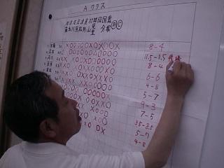 関東囲碁部報(98-017)5.25.98 館山合宿報告! 98年度春の合宿結果報告 春の合宿は33名が参加して、大変に盛況でした。 また、今回は合宿への初参加の方が多く、新鮮な顔ぶれで,合宿を 盛り上げてくれました。(和室ではビール片手に対局。終了すると、観戦していた方の 指摘がはじまります。「岡目八目」の言葉がよくわかる場面が たびたびみられました。) 大会は以下の要領で開催されました。 1.本戦 A,B,Cの3クラスに分かれてそれぞれ総当りリーグ戦を行いました。 2.早碁選手権 リーグ戦を早々に消化してしまった早打ち派8名による30分切れ負け トーナメントの早碁選手権(第3回)を行いました。 結果は以下のとおりです。 合宿リーグ戦 Aクラス (11名参加) 優勝 高本 6.5段 11.5勝 0.5敗 2位 羽山 4.5段 9勝 3敗 3位 加藤 7段 8勝 4敗 Bクラス (11名参加) 優勝 新名 4段 9勝 3敗 2位 尾崎 4段 8勝 4敗 3位 森 3段 7.5勝 4.5敗 Cクラス (11名参加) 優勝 石田 2段 9勝 3敗 2位 金子(良)2段 8勝 4敗 3位 和田 3段 7勝 5敗 対局は、45分切れ負けの真形ルール採用によるハンディ戦で 各クラス総当りリーグ戦の10局と他クラスの同一順列の方2名の 合計12局という方式で対戦がくまれました。 (例えば、Aクラスの 3番目の方はBクラスとCクラスの同じく3番目の方と対戦という意味 です) Aクラスの高本さんの11.5勝0.5敗 というのは、近来にない 素晴らしい成績です。野球でいえばノーヒット・ノーランにあたる でしょうか。今度はパーフェクト(全勝)をめざしてほしいところです。