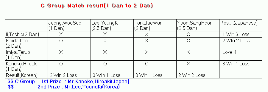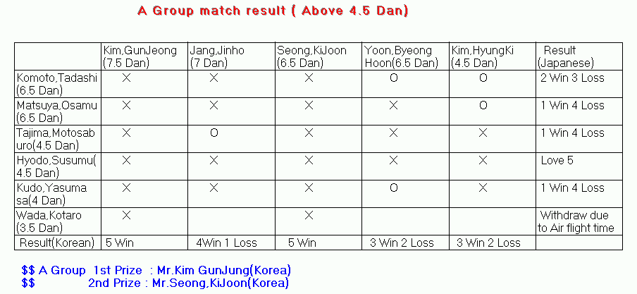 To: IGO cc: From: Kenshi Ohki/Japan/IBM@IBMJP Subject: 重いメールです。すみません/関東囲碁部報(99-044)10/15/99第10回日韓親善大会・報告 関東囲碁部報(99-044)10/15/99第10回日韓親善大会・報告 非常に重いメールで大変申し訳ありません。しかし1990年から続いている 日韓IBM大会の第10回目が盛大にそして無事終わりましたからお許し下 さい。デジカメ写真は高本さん、総合幹事は大和の木谷さん、韓国IBM 側はKahngさんの熱意で実現しました。取急ぎご報告をさせて頂きます。なお、写真は16枚受取り、1枚のみ転載いたします。 残りは関東囲碁部ホームページをご覧下さい。 *****************以下は転送記事です。***************** Subject: 10TH BADUK EXCHANGE RESULT SUMMARY 第10回日韓交流囲碁&雪嶽の旅 ツアー参加者各位 皆さん、お疲れ様でした。 拙い日本側幹事に対する皆様の絶大なるご協力のお陰で、何とか日本 に無事帰着出来たことに感謝しております。 早速に Kahng さんから結果を知らせていただきましたので、転送します。 木谷晴彦 日本IBM 知的所有権 (LAB-A85) Tel 0462-73-3348, Fax:0462-75-5296 E-Mail: hkitani@jp.ibm.com To: baduk cc: Kenshi Ohki/Japan/IBM@IBMJP@IBMAU, Haruhiko Kitani/Japan/IBM@IBMJP@IBMAU, Kohtaroh Wada/Japan/IBM@IBMJP From: Hyuk KAHNG/Korea/IBM@IBMKR Subject: 10TH BADUK EXCHANGE RESULT SUMMARY How are you doing,Baduk members? The 10th Baduk exchange event was held from October 6 until October 10 and the Japanese 19 participants including 3 ladies enjoyed their tour to Seolak Mountain,Kynungpodae,Odaesan temples,Korean food,etc. Japanese participants expressed deep impression from the gorgeous view of Seolak Mt. and other places and also expressed their heartful thanks for the small hospitality we provided to them. The formal 10th Baduk match was held on October 10 from 10 A.M. until 7 P.M. at IBM cafeteria and there were 31 participants including 16 Japanese and 15 Koreans. The detail result is as follows.