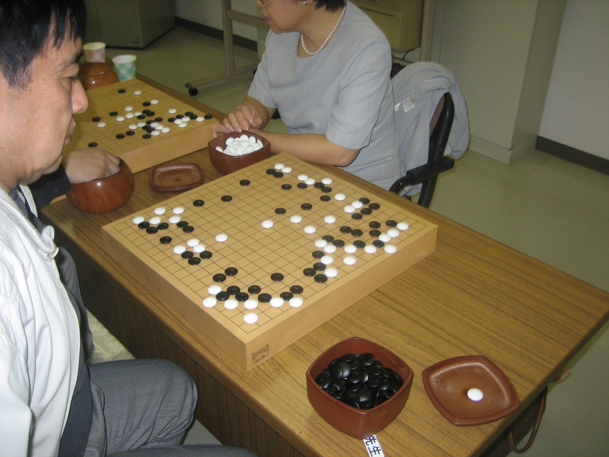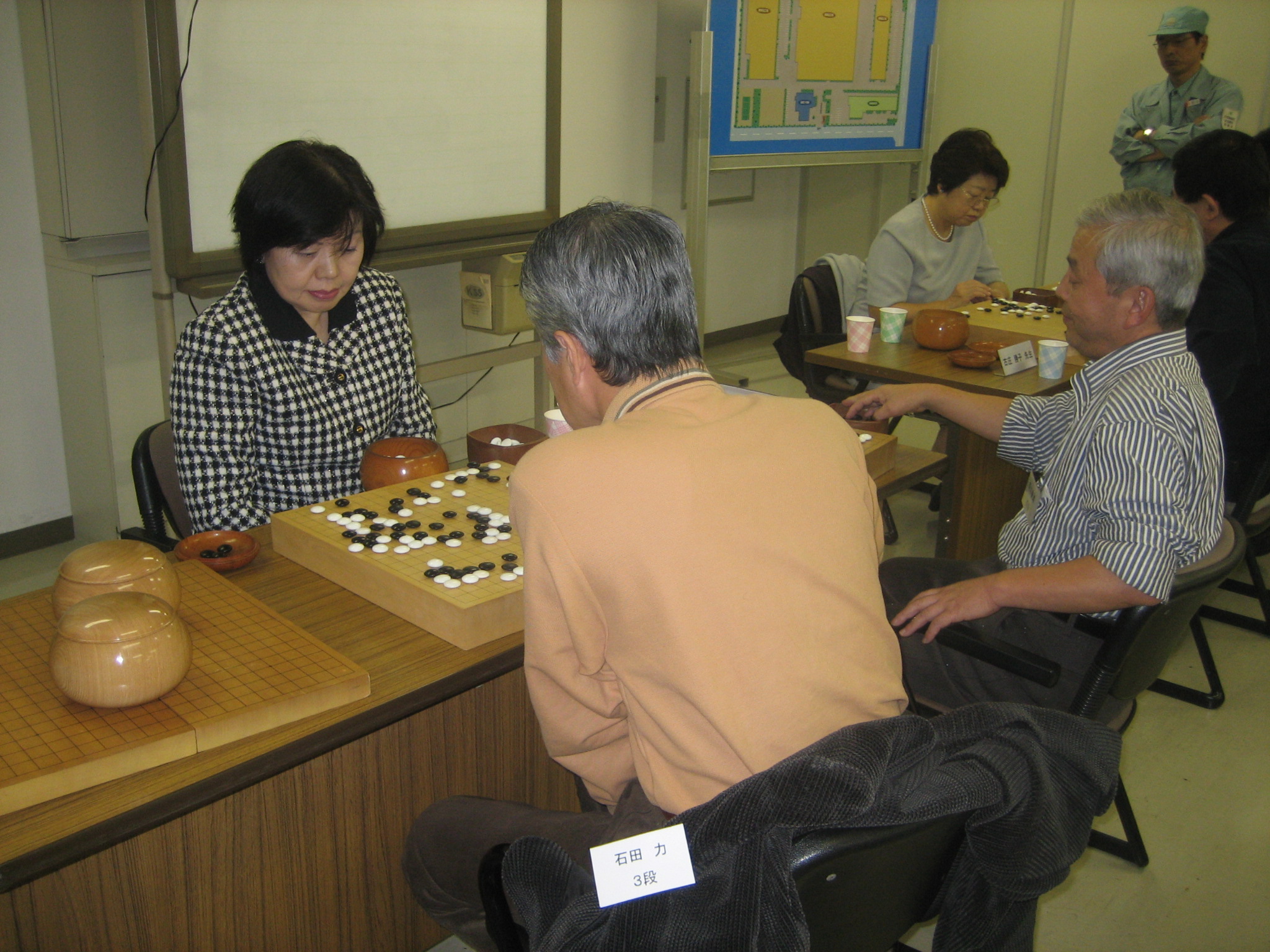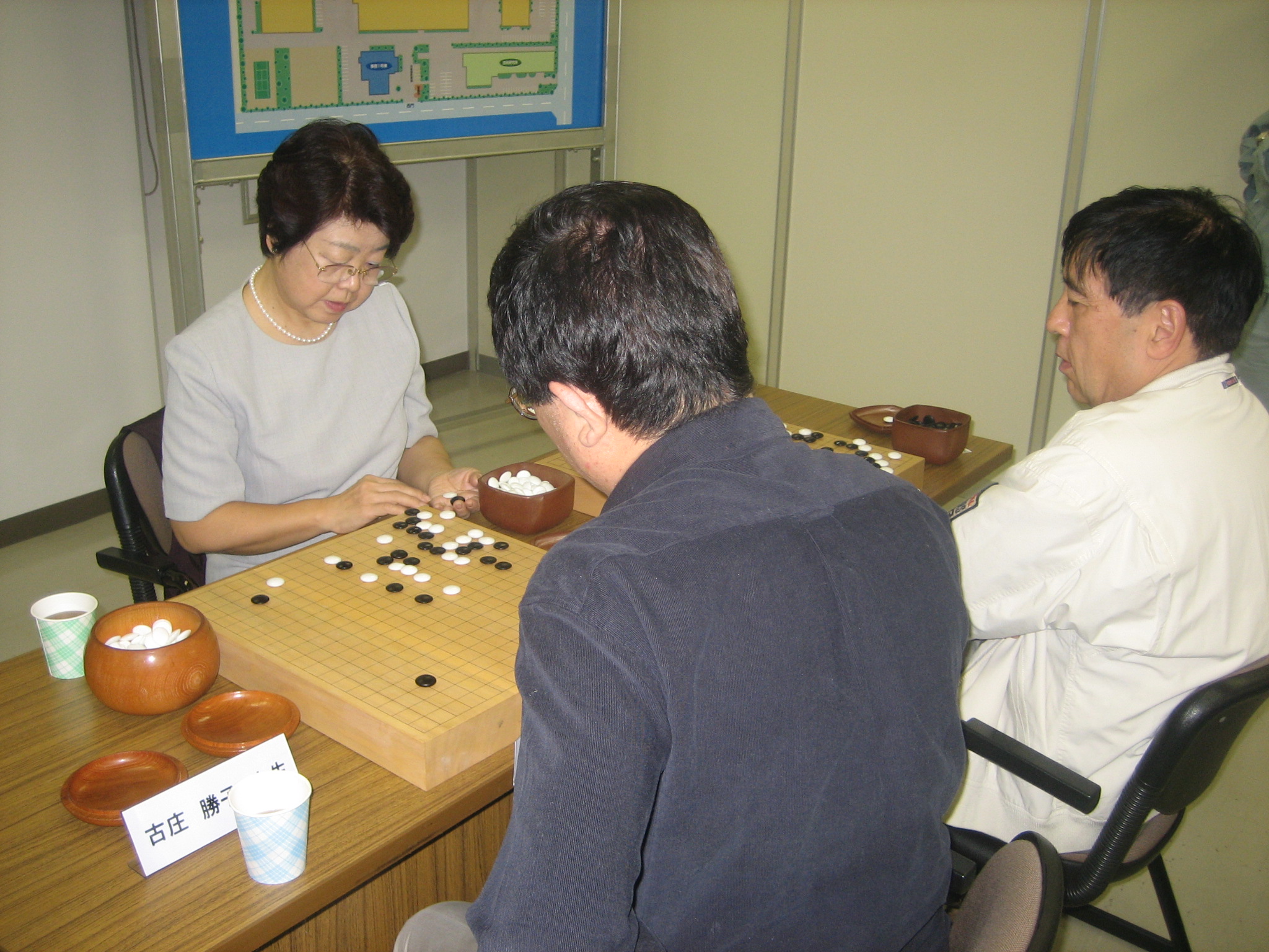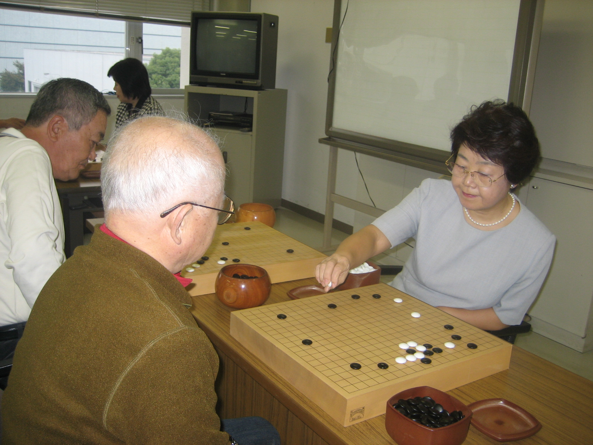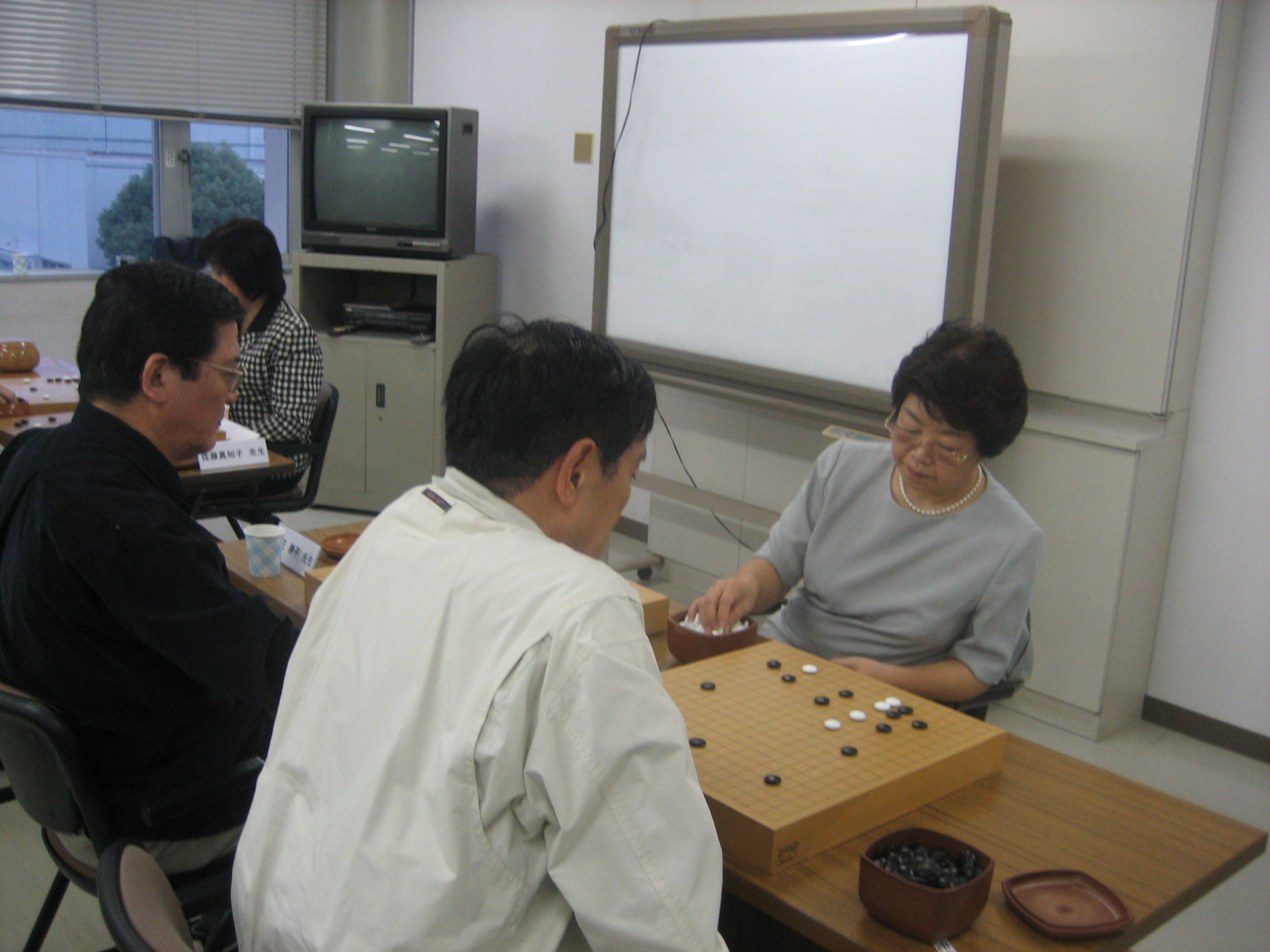 佐藤真知子先生と対戦中の石田さん(手前)、新川さん(奥) 石田さんはみごと勝利、新川さんもジゴとなり健闘されました。 |