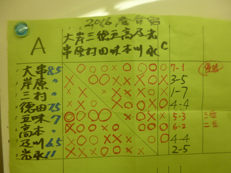 7勝1敗で優勝、2位、3位は久しぶりに合宿に参加したお二人、最近、好調の金子さん
